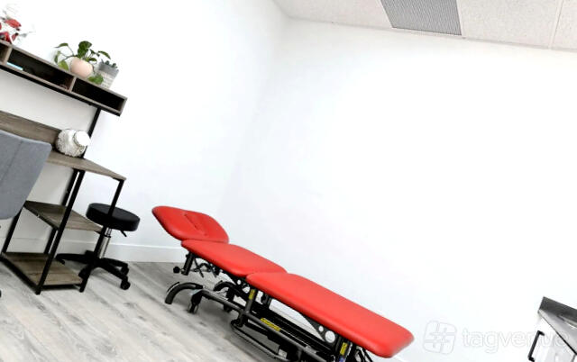 This treatment room includes a desk and chair perfect for office work or Zoom meetings. There is also a top of the line electric Cardon multipurpose treatment table which can be used for massage, physiotherapy, osteopathy, or other bodywork. The room also has a sink and counters pace.