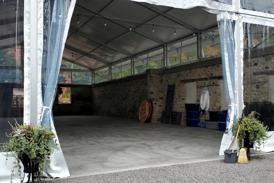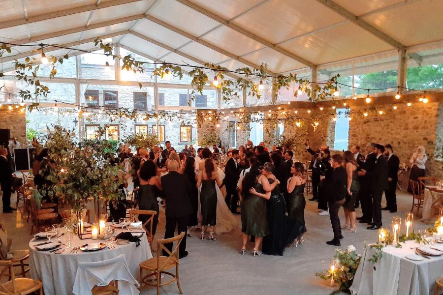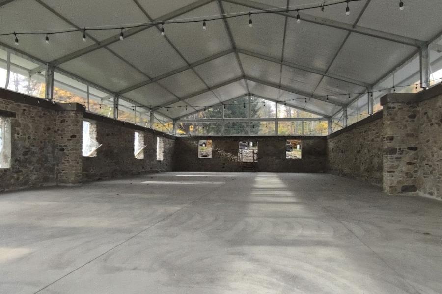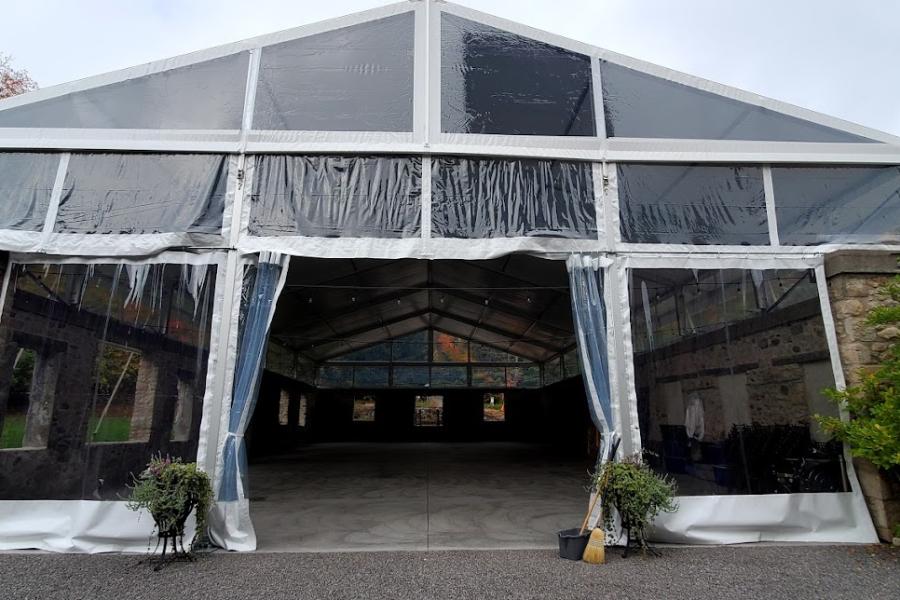 Surrounded by expansive natural gardens, the venue offers both indoor and outdoor spaces. Outdoors, the stone walls provide a picturesque backdrop, with the option of a tent cover for all-weather events.