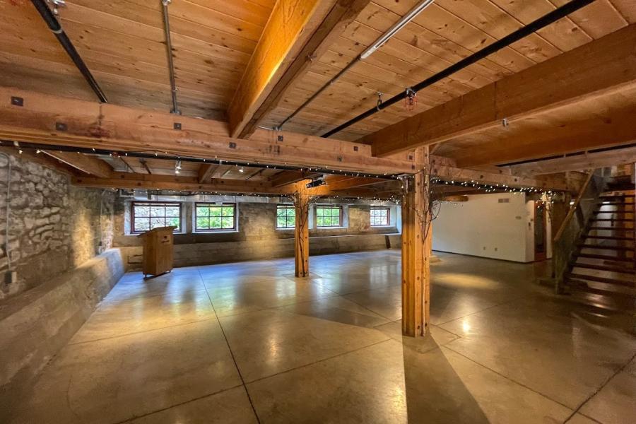 This historic stone building blends old charm with modern elegance, featuring wooden and stone elements inside.
