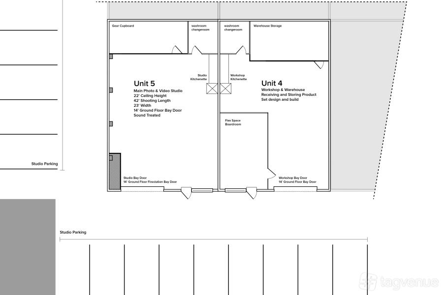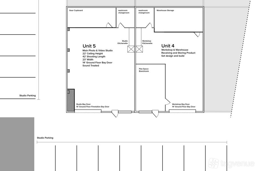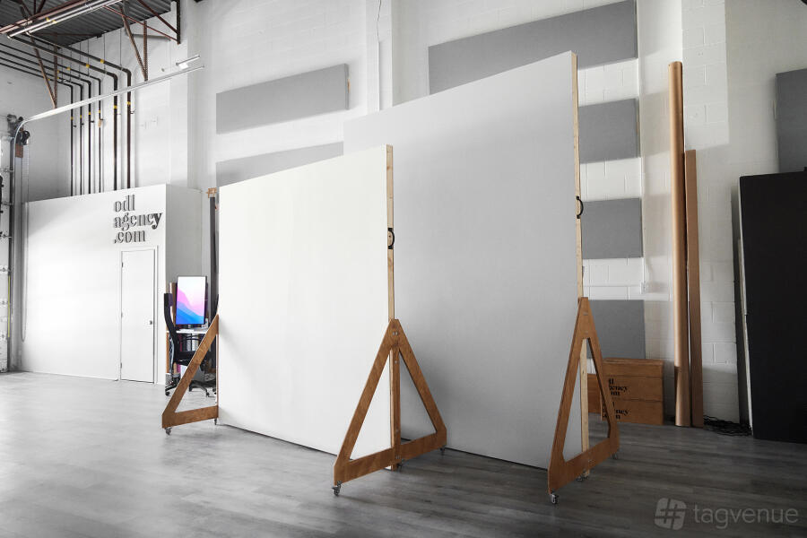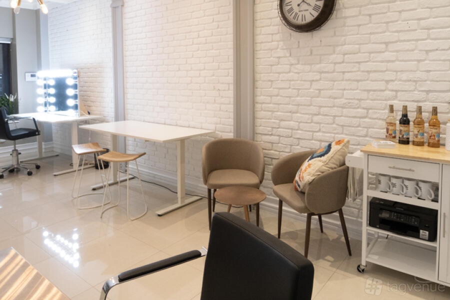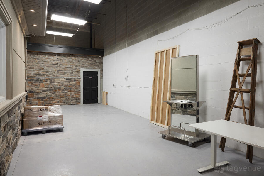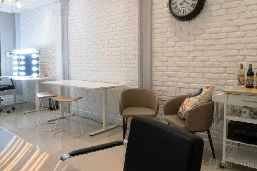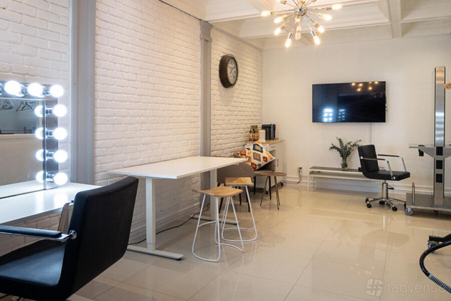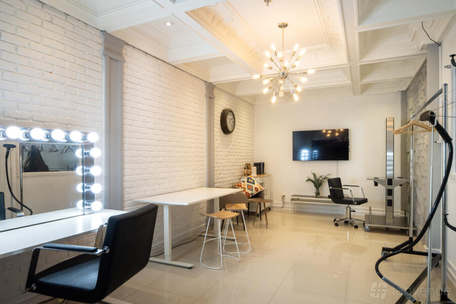 The studio is sound treated for video production and has mounting points for lights around the shooting space. There is also a large 80" TV with wifi transmission available.