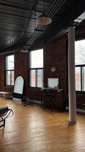 The studio offers a backdrop between 2 colors, natural lighting, industrial-style racks for clothing or content, and a makeup station with warm lighting, making sure to meet all your content and filming needs.