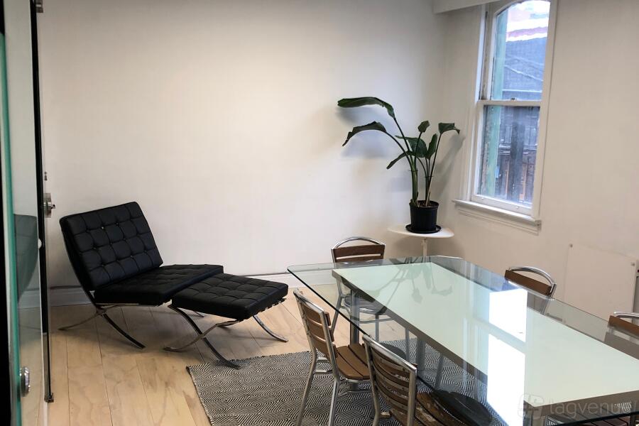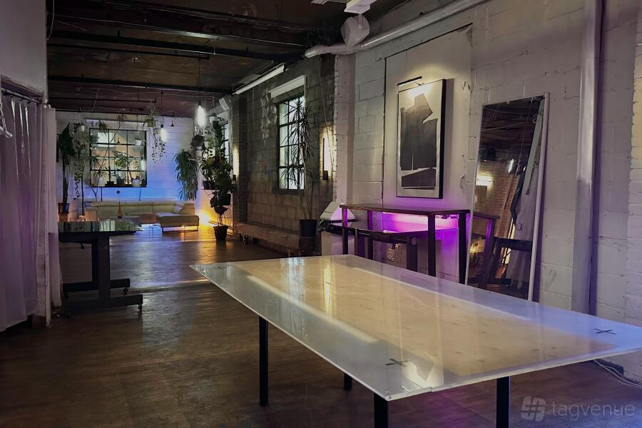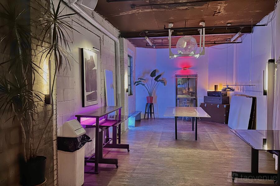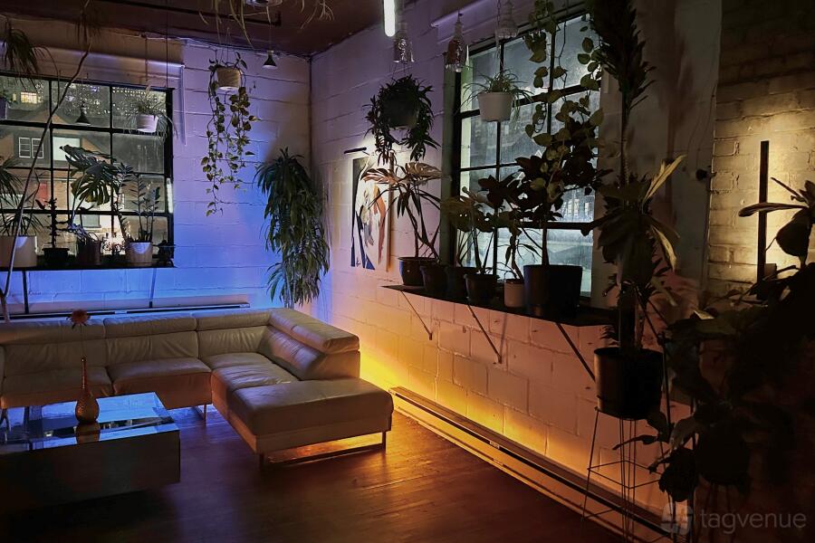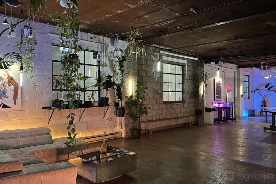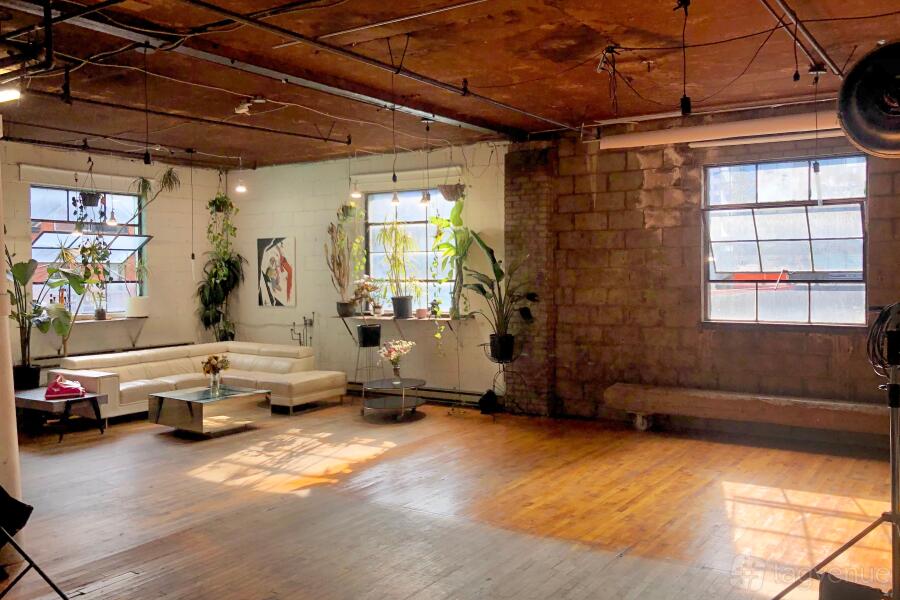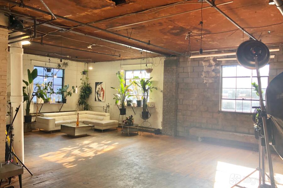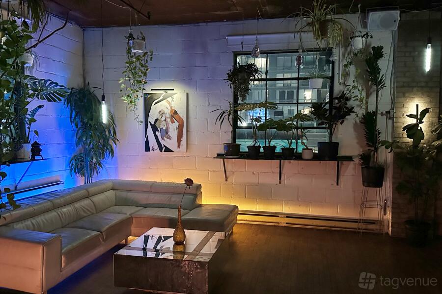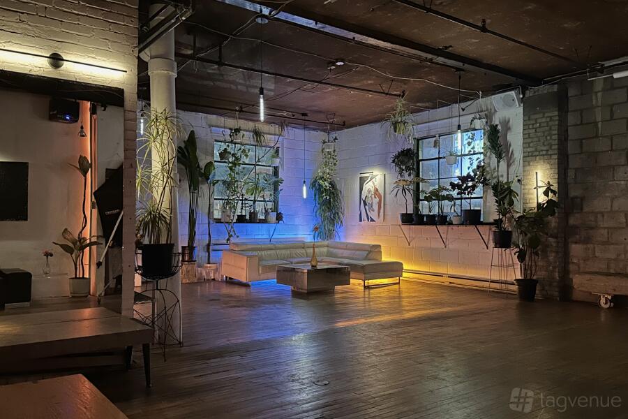 The 2000sq/ft main room production studio and event space with 100-year-old character, and beautiful old factory windows. Furnished with large modern leather couches and decot, and a beautiful tropical plant collection! We have several types and sizes of tables, many additional chairs, furniture & decor, professional photography lighting, video lighting, event space customizable mood lighting... We have it all and are the most popular rental space in Toronto for a reason! :)