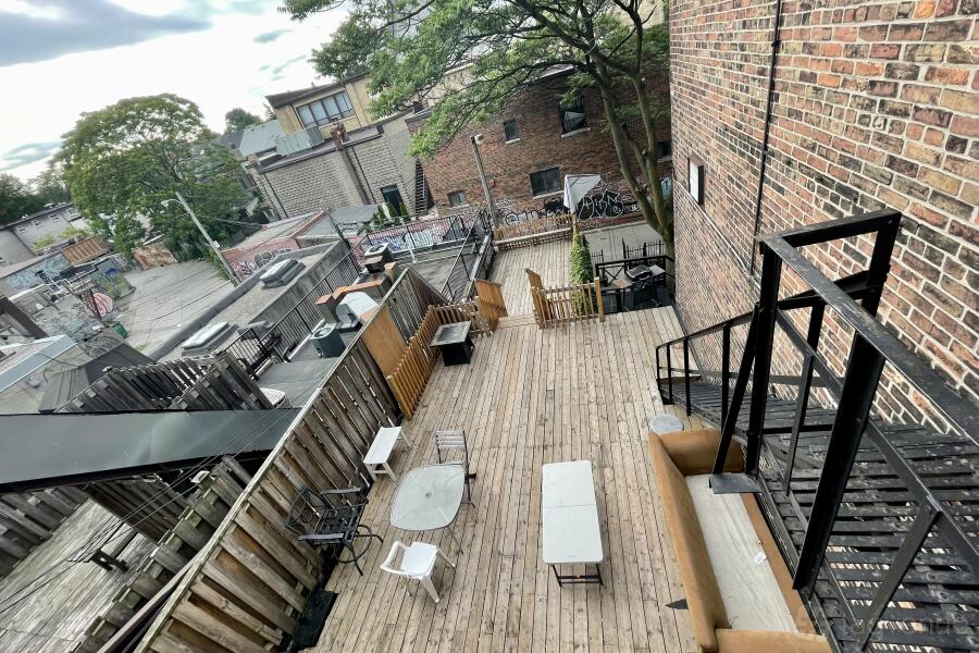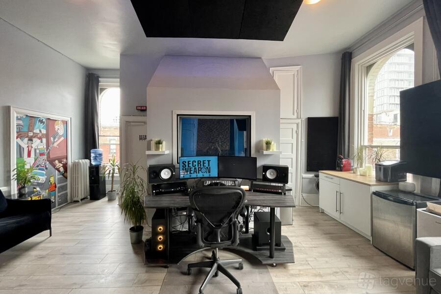 The space includes a large control room and spacious booth with high loft style ceilings and cathedral windows that overlook Queen St W. There is also a large back patio for your use.