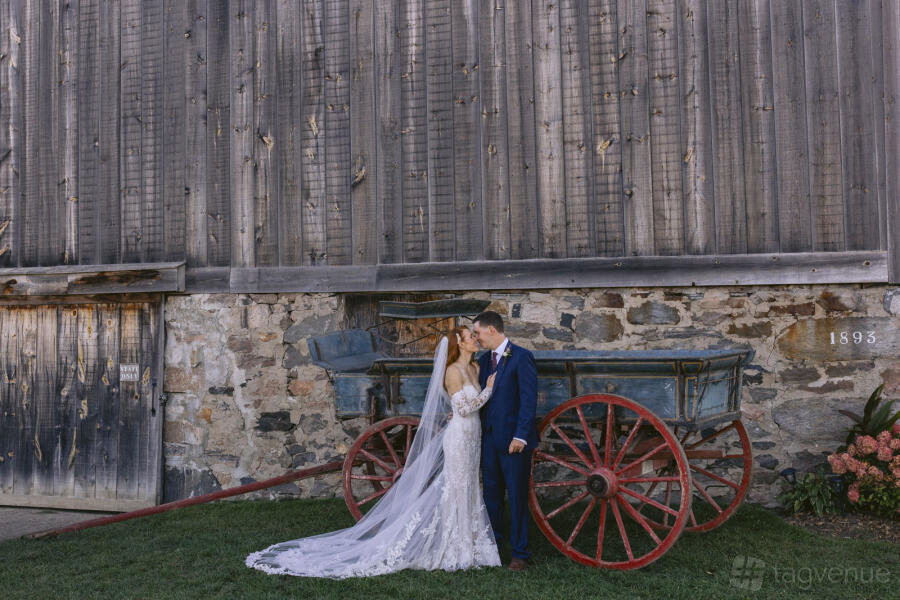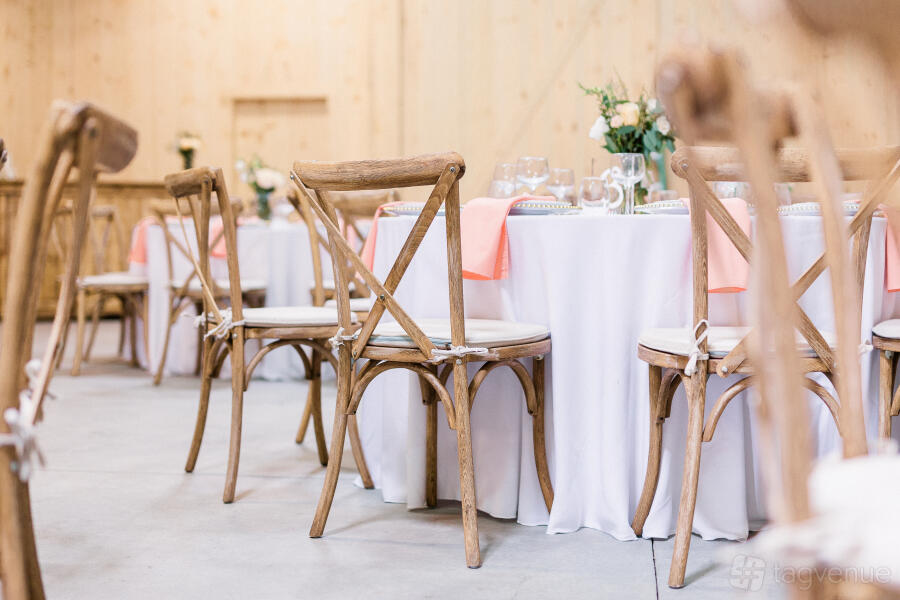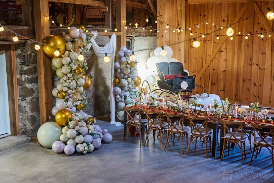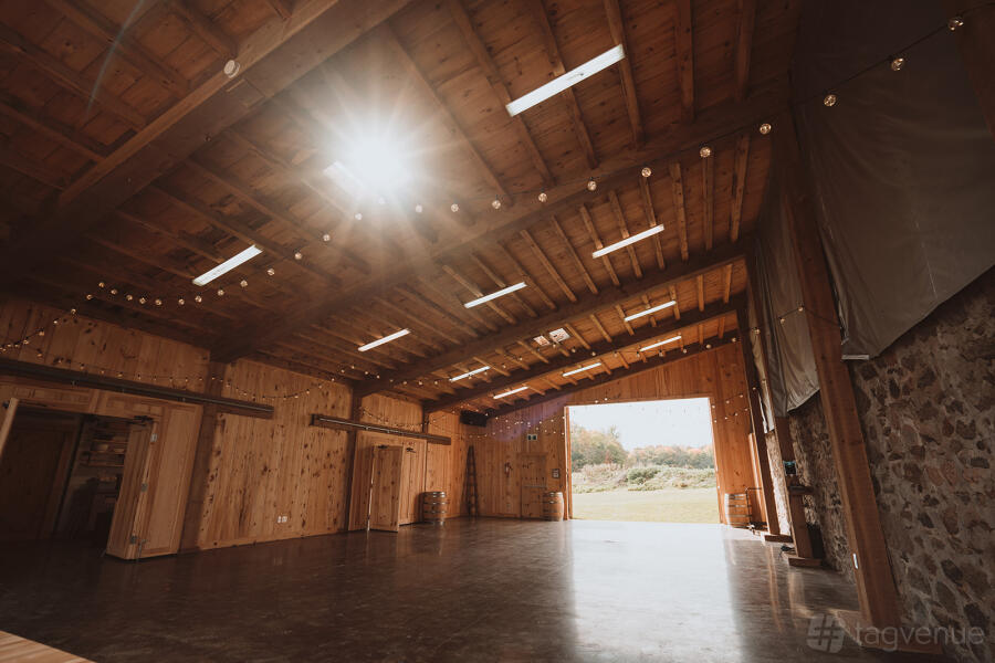 Fermanagh Farms offers both indoor and outdoor ceremony and reception spaces. The all-season Lower Barn is ideal for up to 135 seated guests, featuring high wooden ceilings, timber beams, polished concrete floors, exposed brick, and warm string lighting. For larger celebrations, outdoor tented options can accommodate up to 400 guests. Acres of meadows, ponds, forests, gardens, and antique farm machinery provide endless photo opportunities.