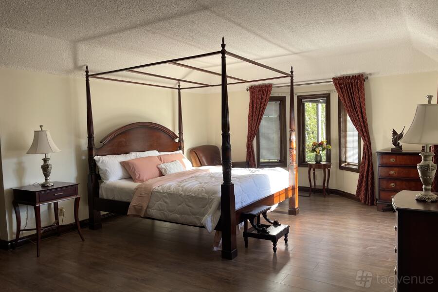 10 Spacious bedrooms with: 4 King Size, 5 Queen Size Beds and 1 Junior Bed. Huge 3000 sq.ft. heated pool, indoor jacuzzi, pool table and much more. The property also has private trails in the forest and a huge lawn to use for outdoor events.