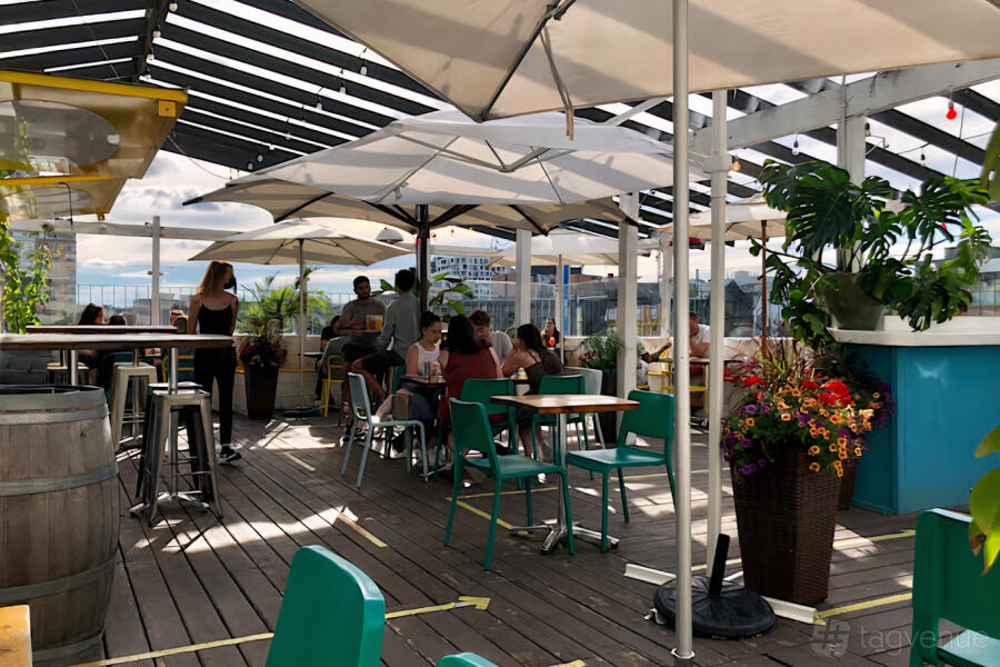 For those who crave the open air, head upstairs to the patio—a modern oasis with a design that mirrors the city's dynamic energy. Wooden floors, bright elements, and a spacious layout set the stage for unforgettable summer parties. Perched on the rooftop, the patio offers breathtaking views of the cityscape, making it an ideal spot to revel in the beauty of Toronto. Whether you're basking in the sun under umbrellas or staying warm on cooler nights with heaters, the rooftop experience at Bar Hop is unparalleled.