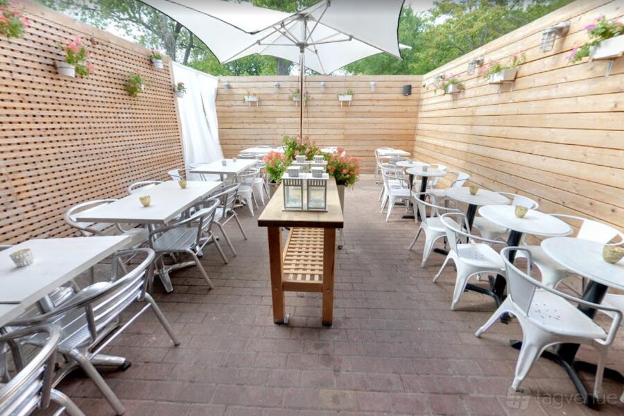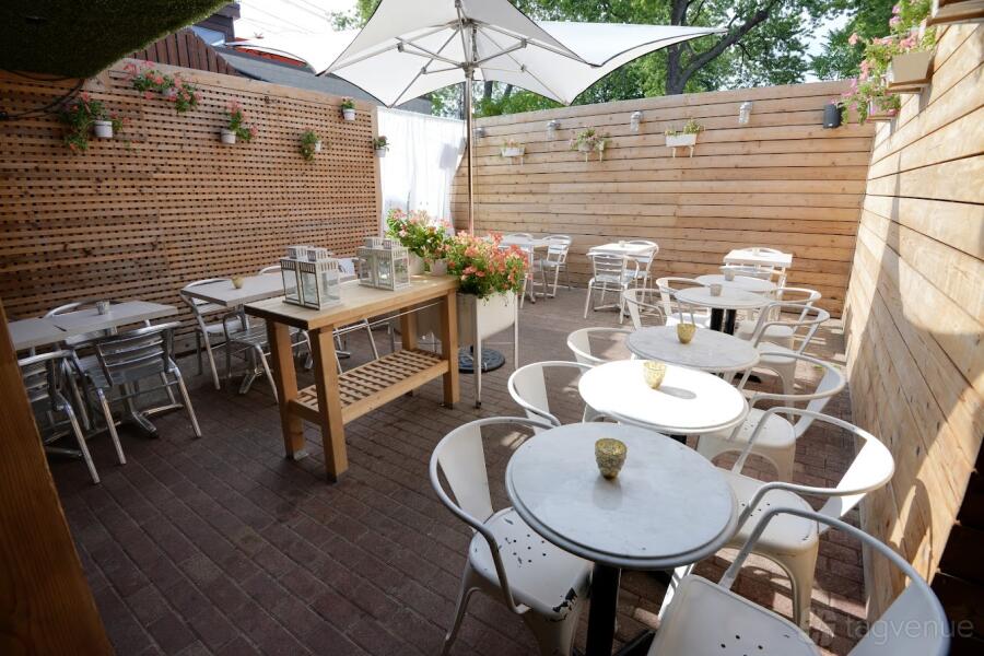 Our cozy, all-season private dining area is an excellent option for groups looking for a relaxed outdoor patio space in the summer, covered and insulated for the winter, for up to 30 seats; and 40+ standing.