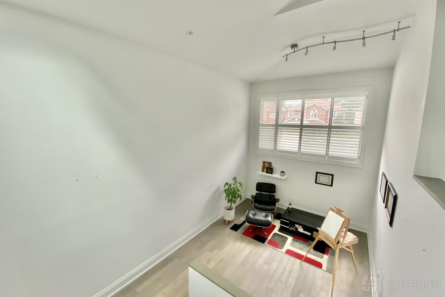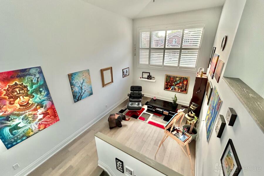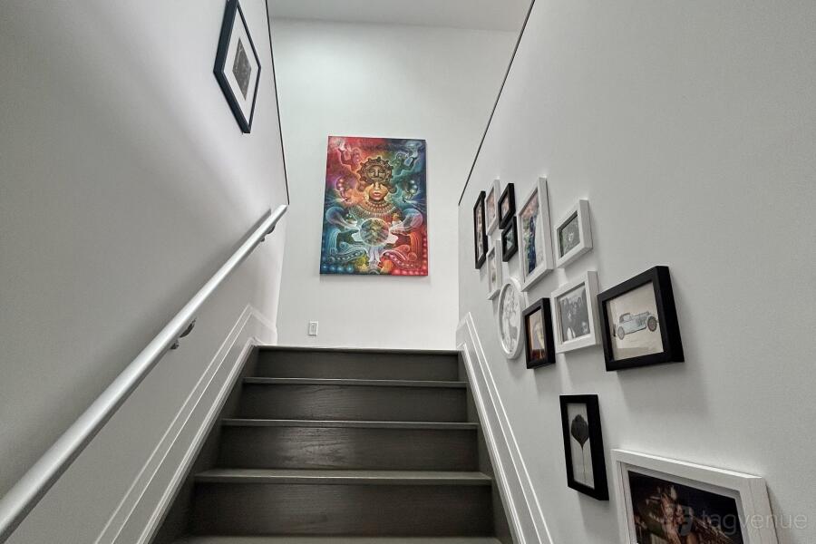 Up the stairs from the main floor is the loft office/art gallery that showcases different artwork, to the right of the loft area is a staircase leading to the upstairs bedrooms.