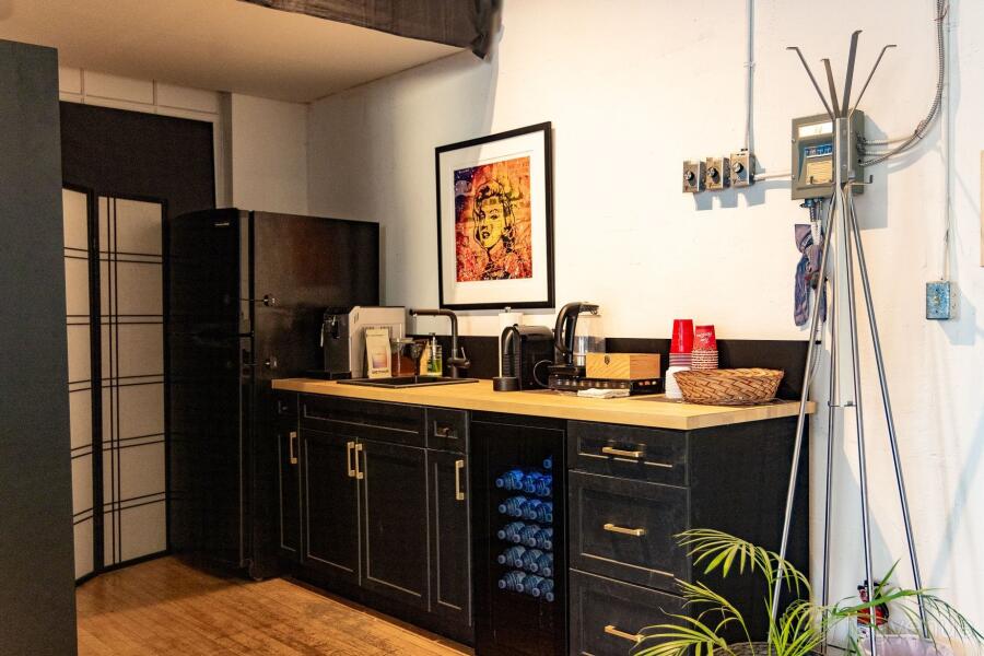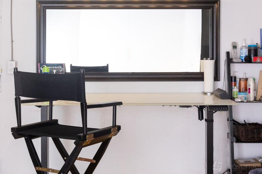 The studio features a dedicated make-up and hair station, a full workspace, and a lounge area stocked with refreshments.