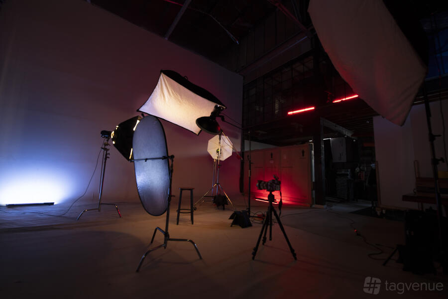 Our studio features two expansive main areas, a mezzanine, and optional specialty spaces like the Neon Demon room and private VIP lounge, allowing for multiple environments under one roof. The venue’s unique architecture, exposed beams, lofty ceilings, and a striking white cyclorama provide a visually dynamic backdrop ideal for both live audiences and on-camera productions.