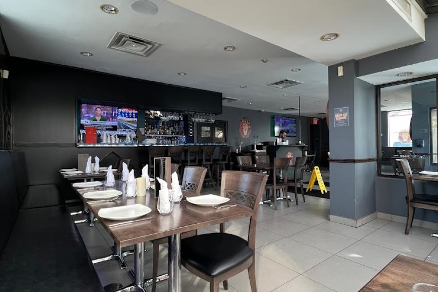 Our open main dining area is furnished with a grey, black, and white palette, complemented by warm wooden accents. The bar area, lit with green lighting, provides an intimate space for impromptu conversations.