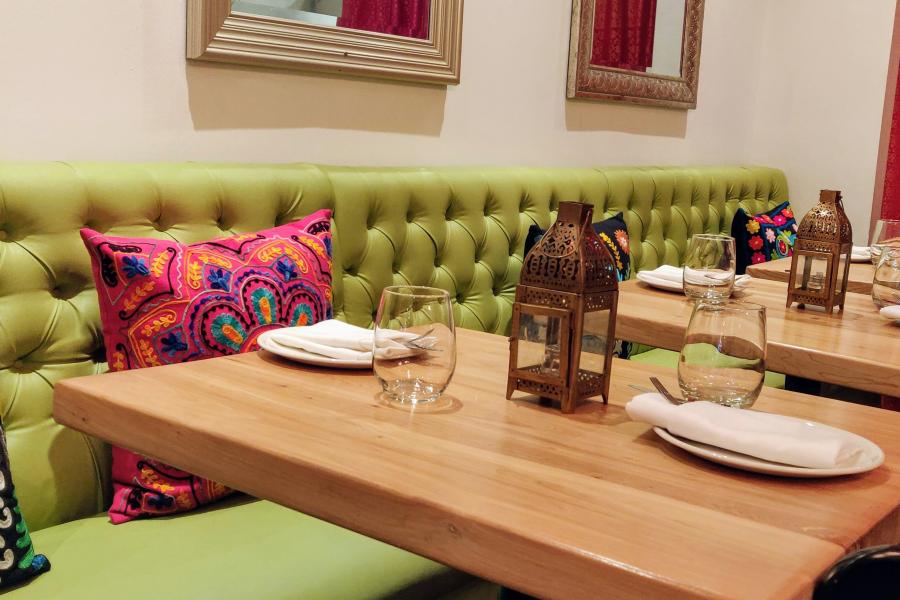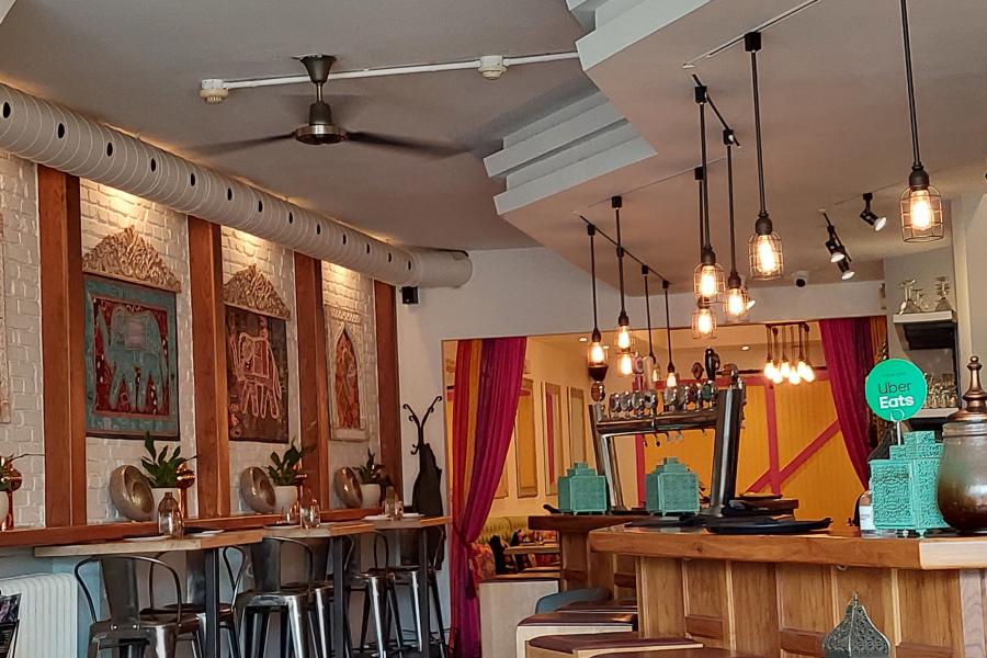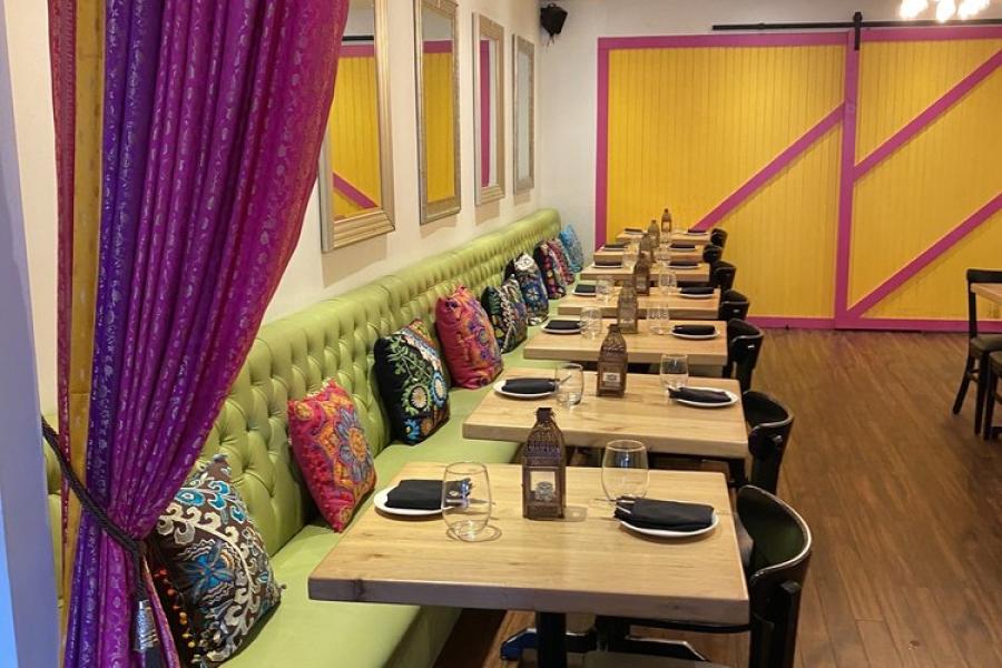 For a more intimate experience, our Semi-Private Space at the back of the restaurant offers an elegant setting. Separated by colourful curtains, this space features white walls adorned with mirrors, dark hardwood flooring, and a suspended ceiling with contemporary lights that create a warm and inviting atmosphere. The space is furnished with elegant black chairs, a vibrant green wall bench with colourful pillows, and classic wooden tables, providing a comfortable and stylish setting to savour our authentic Indian cuisine.