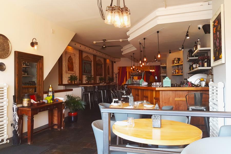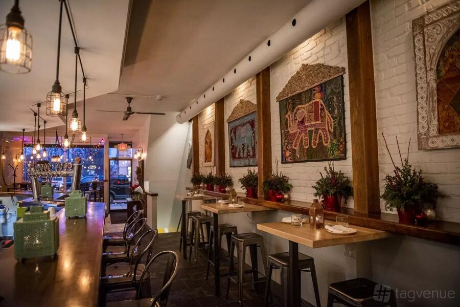 At Cumin Kitchen, we offer two distinct spaces for our guests to enjoy. The Bar Area, located at the front of the restaurant, boasts a cozy ambiance with white walls, dark wooden accents, and cultural Indian decorative pieces that add an authentic touch. The space is adorned with green plants and features an expansive wooden bar under a suspended ceiling, perfect for enjoying a refreshing drink or two.