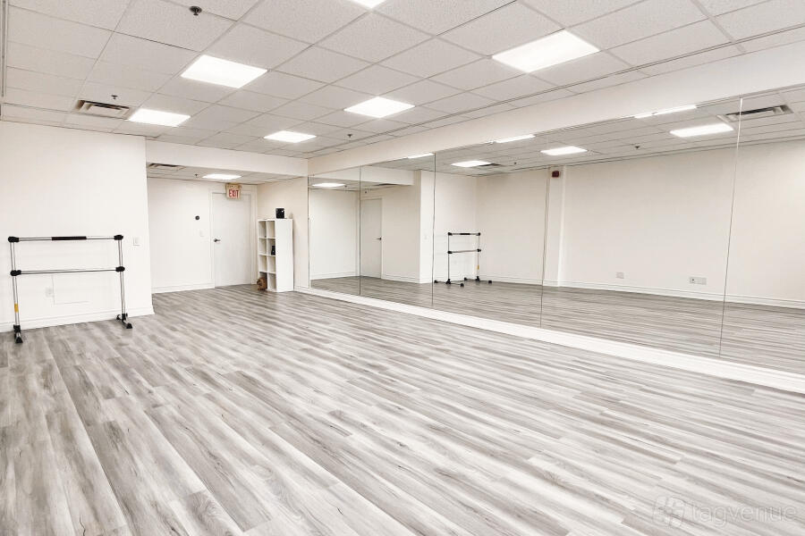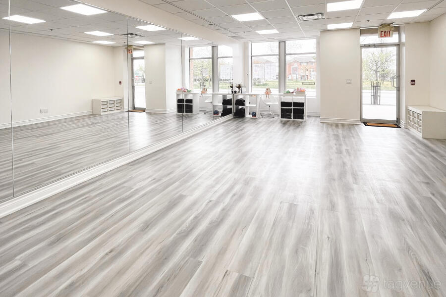 This spacious studio boasts 750 square feet of dance floor, perfect for practicing your routines. Large mirrors lining the walls allow you to perfect your form and technique. No need to bring your own equipment – portable barres, yoga mats and yoga blocks are ready and waiting for ballet, yoga, or barre fitness classes.