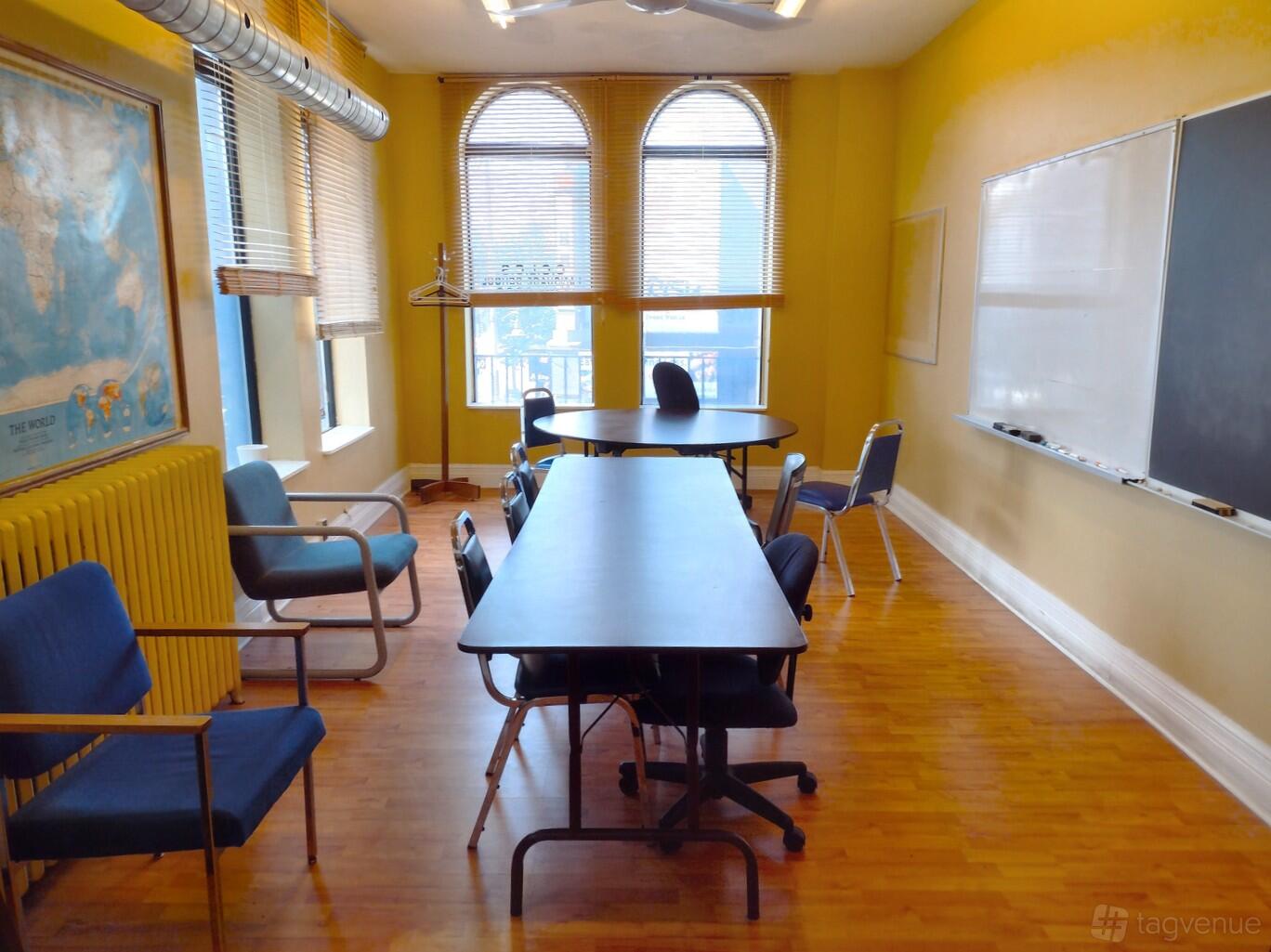 Our facilities include a kitchenette and other amenities, as well as chalkboards, whiteboards, and WiFi. Additionally, we have a back deck for some fresh air. We are conveniently close to a subway station, cafes, and restaurants.
