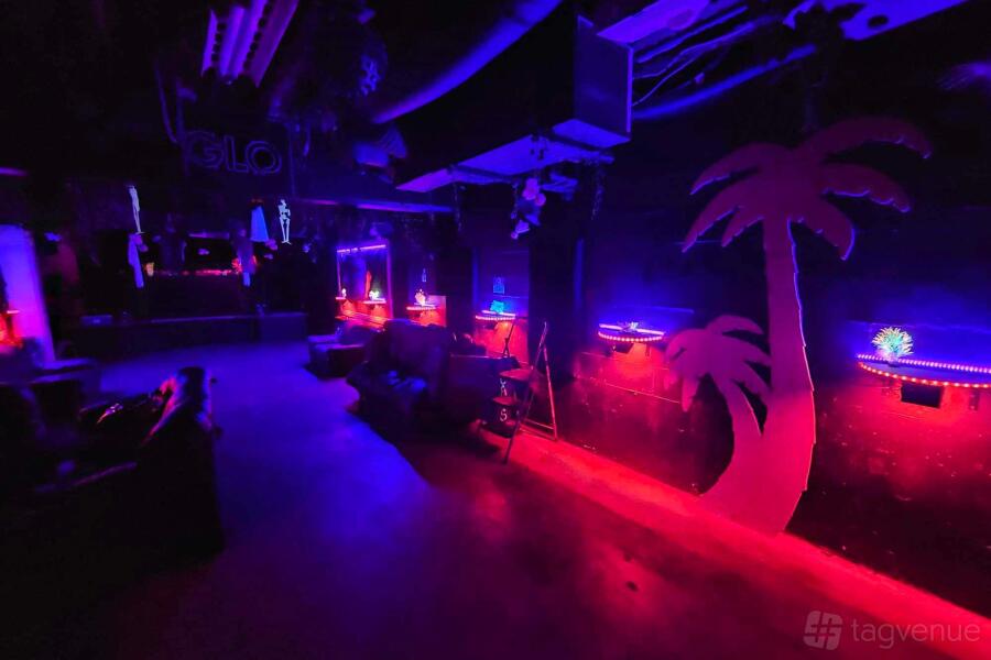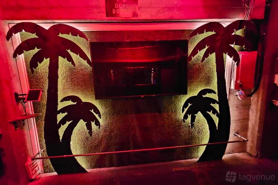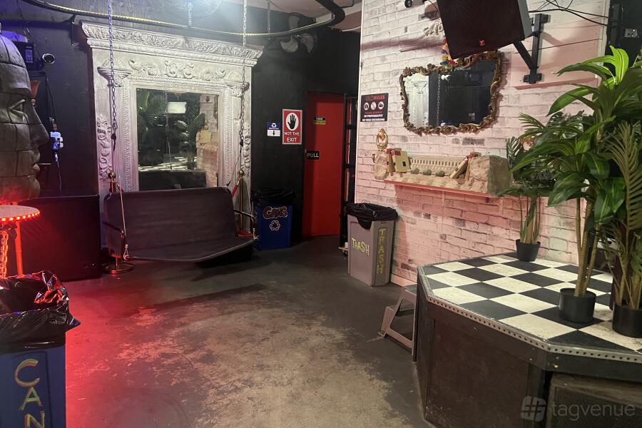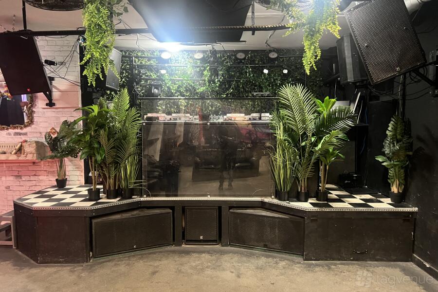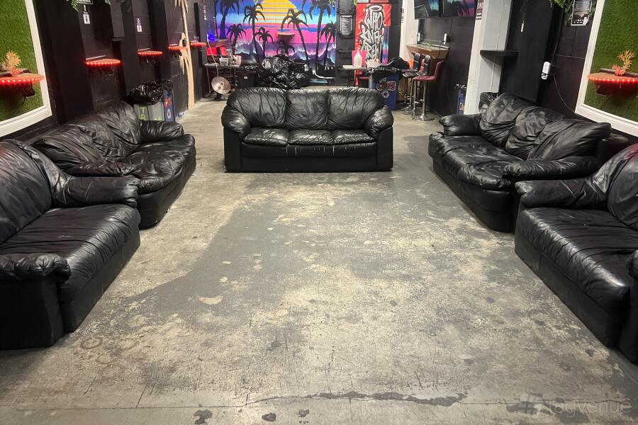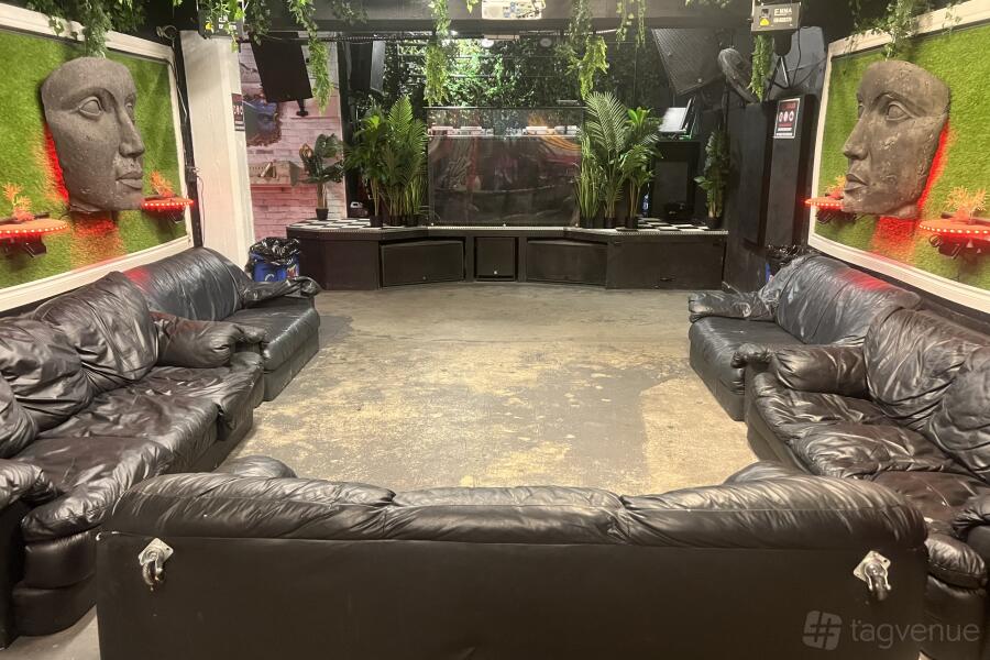 Our space is an open concept consisting of two separate rooms and a smoke pit. The main room is soundproofed and contains the stage, DJ / lighting / sound equipment, TVs, the bar, and 868 sf of the open space dance floor. The second chill room contains our coat check and 5 couches, a TV, and ambient color-changing lighting. There is also a covered outdoor Smoke pit. We have three bathrooms onsite (one flush and two porta-potties).