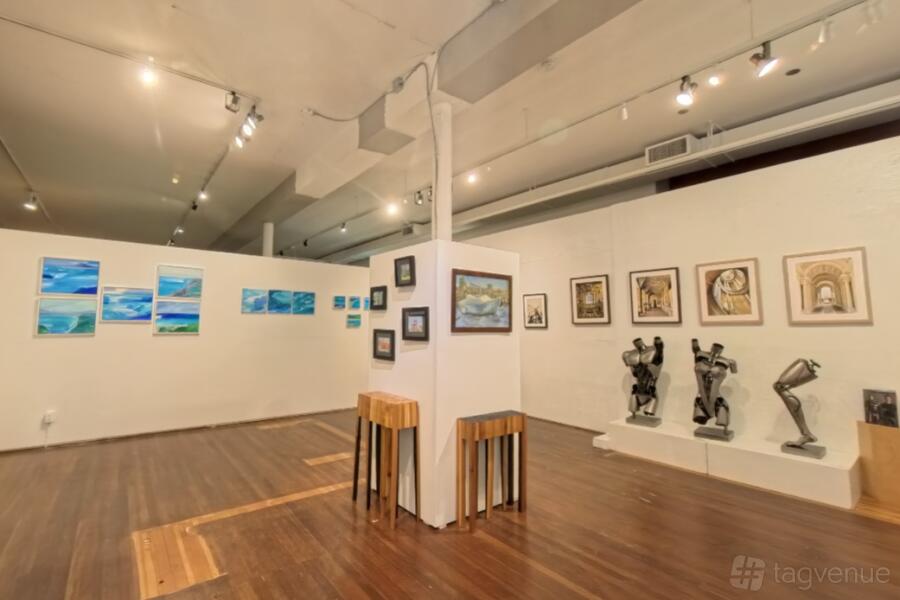 The front gallery offers 900 square feet with beautiful street-facing bay windows at street level. The inner gallery provides a large, open space of 680 square feet with 12' 5" ceilings. Our capacity is approximately 125 people.