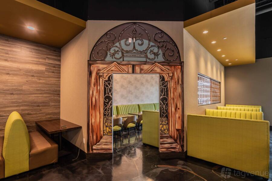 The ambiance at Drupati's is a seamless blend of modern elegance with a burst of vibrant colors. Divided into two distinct areas, the main space boasts mesmerizing stone flooring, a partially suspended ceiling, wooden accents, and walls adorned with colorful art and golden touches. For those seeking a more intimate dining experience, the venue offers a semi-private dining room, which adds an extra touch of exclusivity.