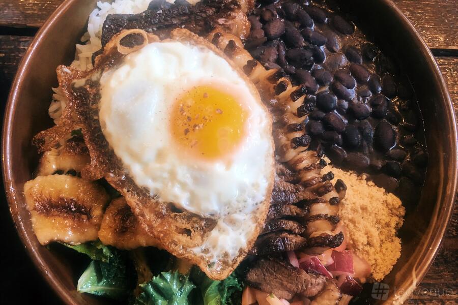 Charred corn, yellow tomato salsa, cilantro-lime crema, smashed avocado, fried eggs, and tortillas - 13.50
