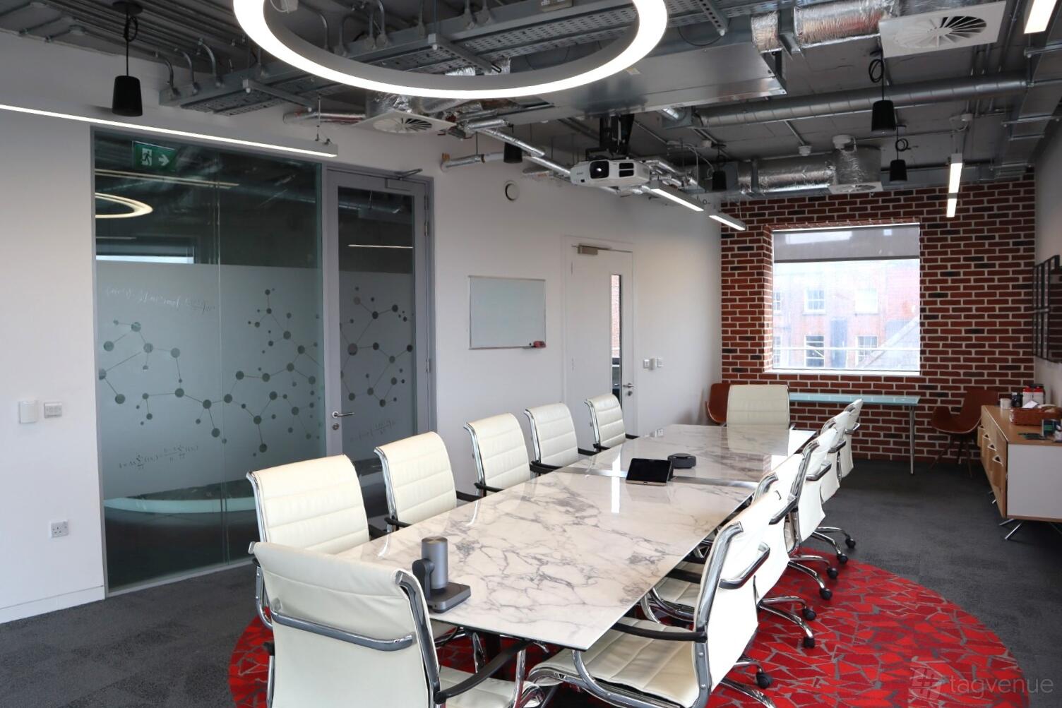 Nuritas offers a well-equipped meeting room at our headquarters, located in Joshua Dawson House, Dawson St, Dublin 2, Ireland. The space is designed to accommodate professional meetings and features a large conference table, a whiteboard, a flipchart, and a projector.