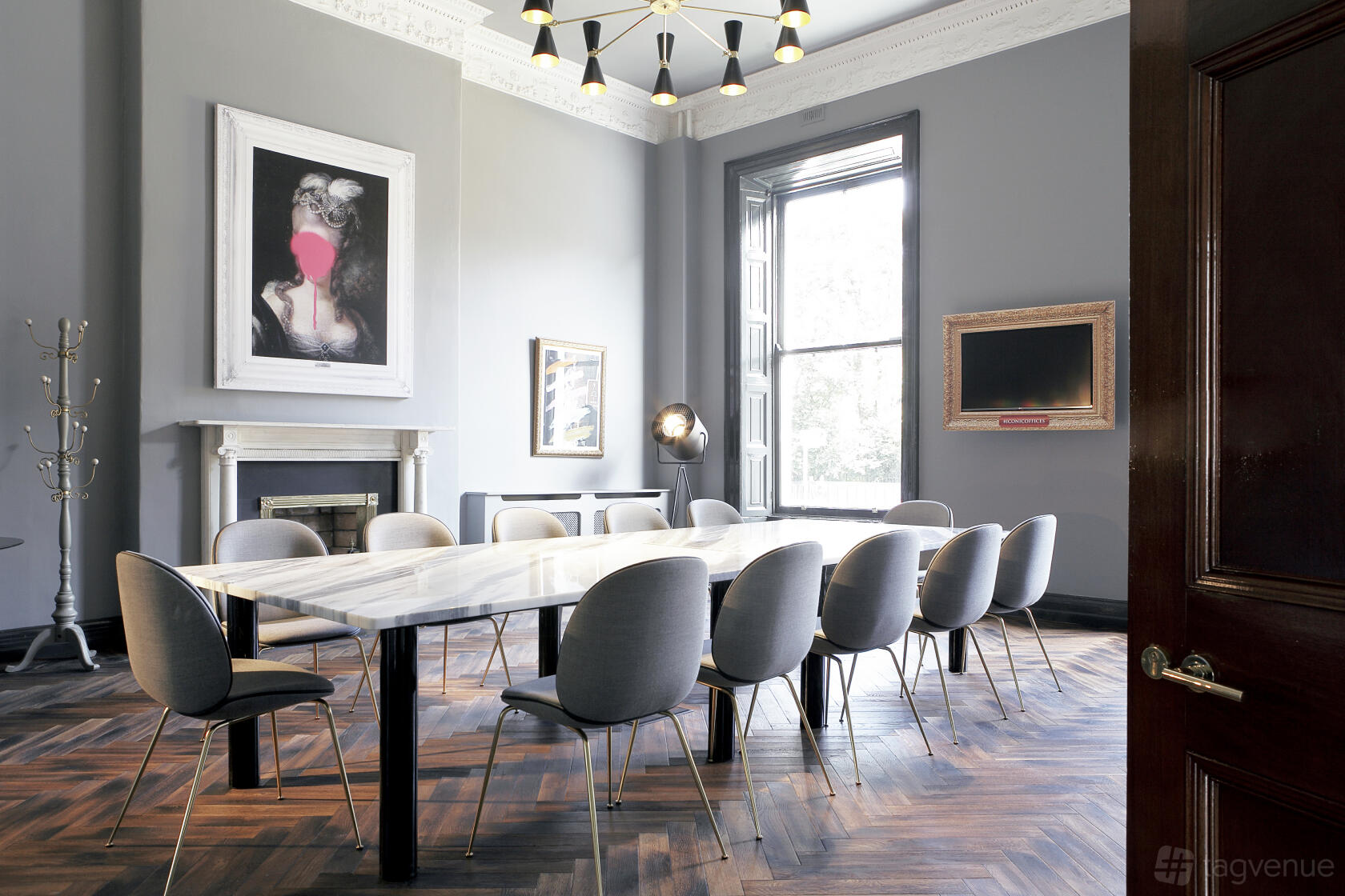This meeting room, overlooking Dublin's historic Merrion Square Park, can comfortably accommodate up to 12 guests at an Italian marble boardroom table.