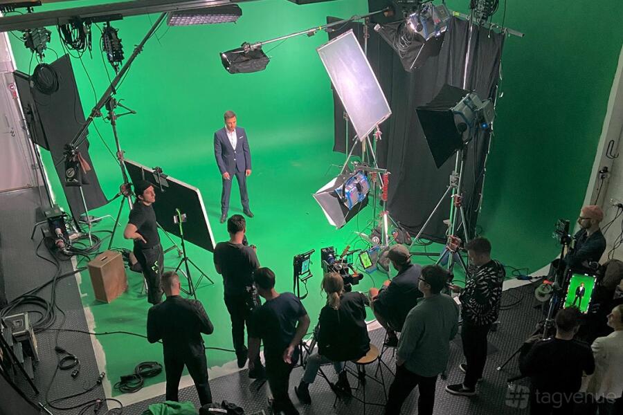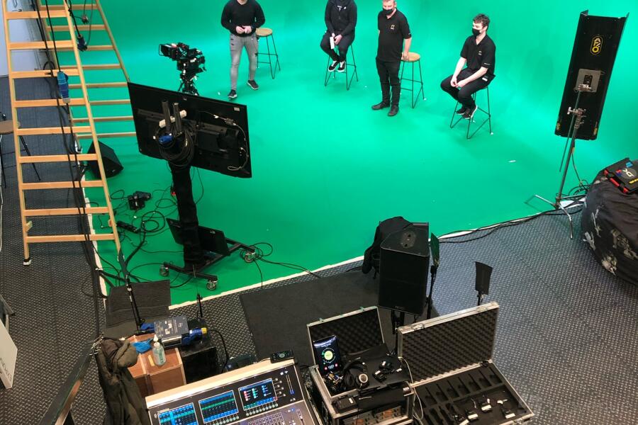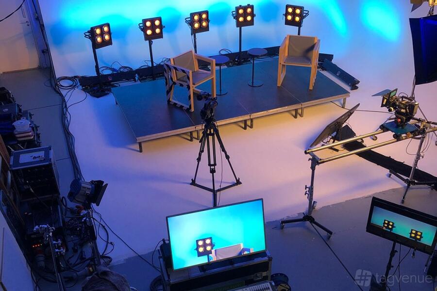 - The studio has a comfortable green room, with a couch and a drinks fridge.