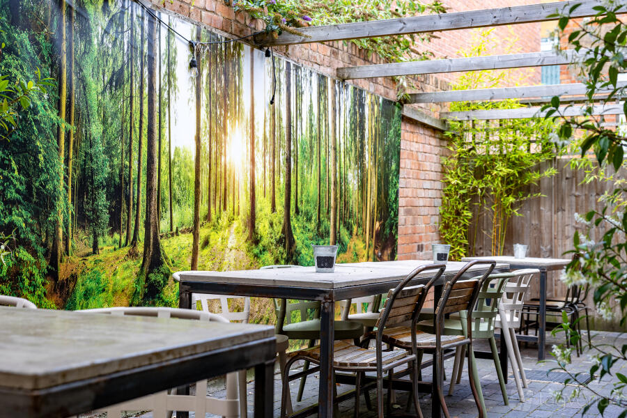 We have a courtyard that is also unique with a lovely forest backdrop and quirky paintings across our brick walls. An outdoor bar, with half covered & half open space which is perfect for every season.