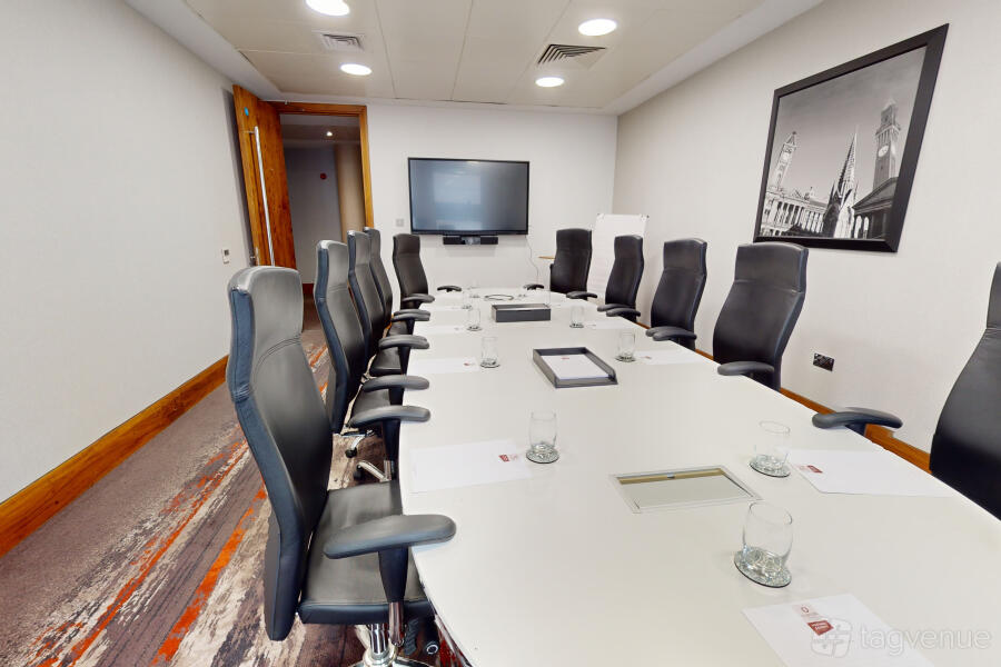 Welcome to Meeting Room 5 at Clayton Hotel Birmingham, an epitome of modern business facilities. This streamlined meeting space is perfectly suited for high-level executive meetings and intimate business gatherings. Outfitted with a sleek, oval conference table surrounded by plush leather chairs, the room offers a comfortable yet professional environment.
