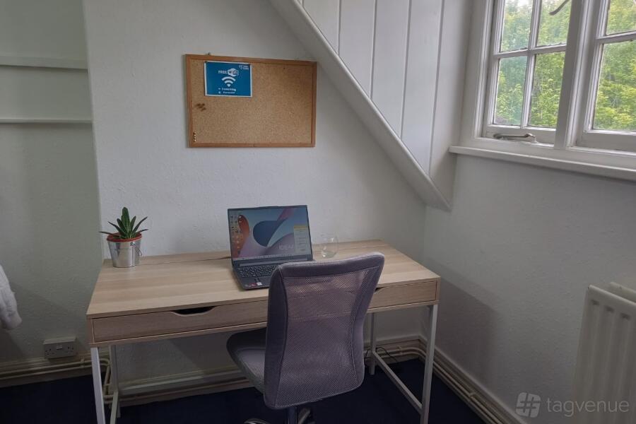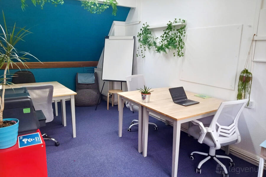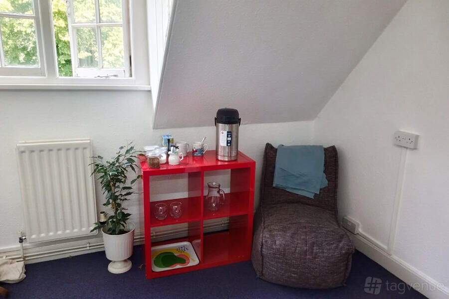 The Willow Room is a versatile and cozy space designed for relaxation and informal meetings. It features a combination of functional and casual seating options, including a futon sofa, bean bags, and various chairs, which offer a comfortable environment for brainstorming sessions or relaxed discussions.