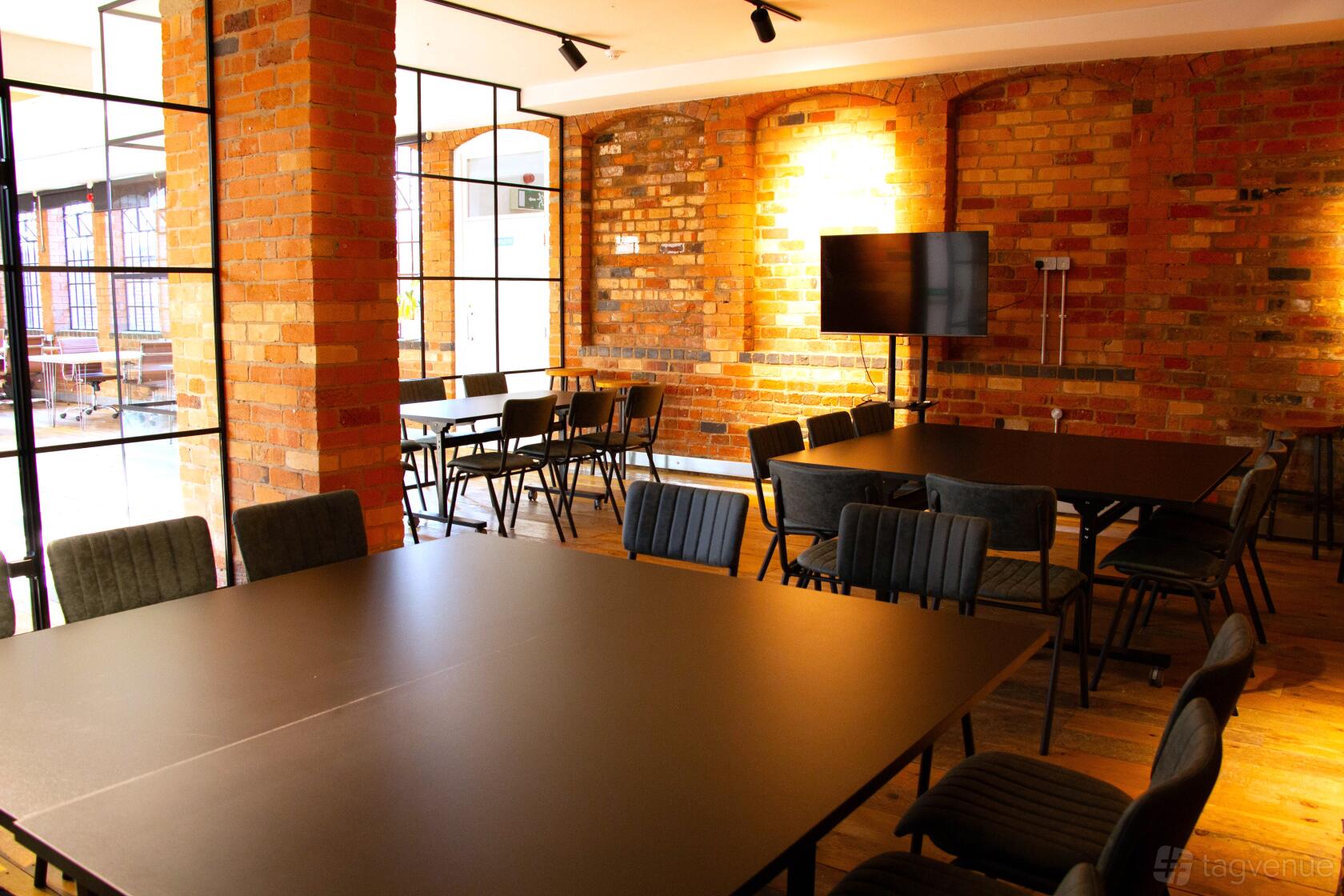 This meeting room can be arranged in multiple layouts for receiving up to 40 guests. It gives off a serious and professional atmosphere, enhanced by the impersonality of the exposed brick walls, giving it an industrial look.