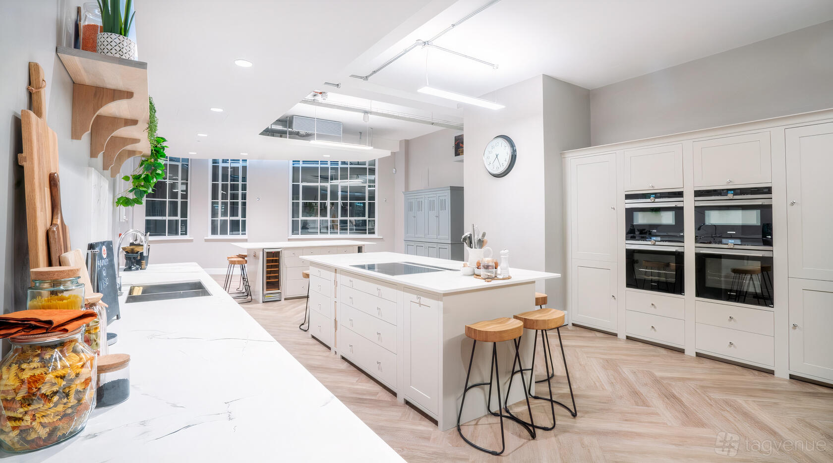 We also have our second floor, which includes a second, smaller kitchen – perfect for prep, smaller footprint photoshoots, straight-to-camera pieces, and as a staging area for events. The floor also has two large meeting tables and a media studio with video editing facilities and Zoom rooms.