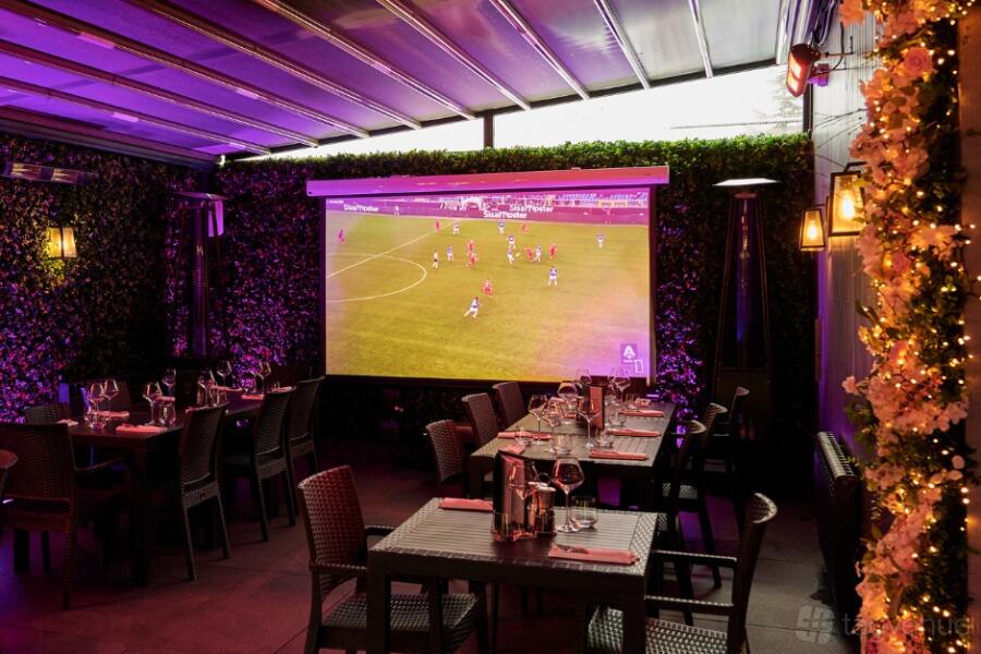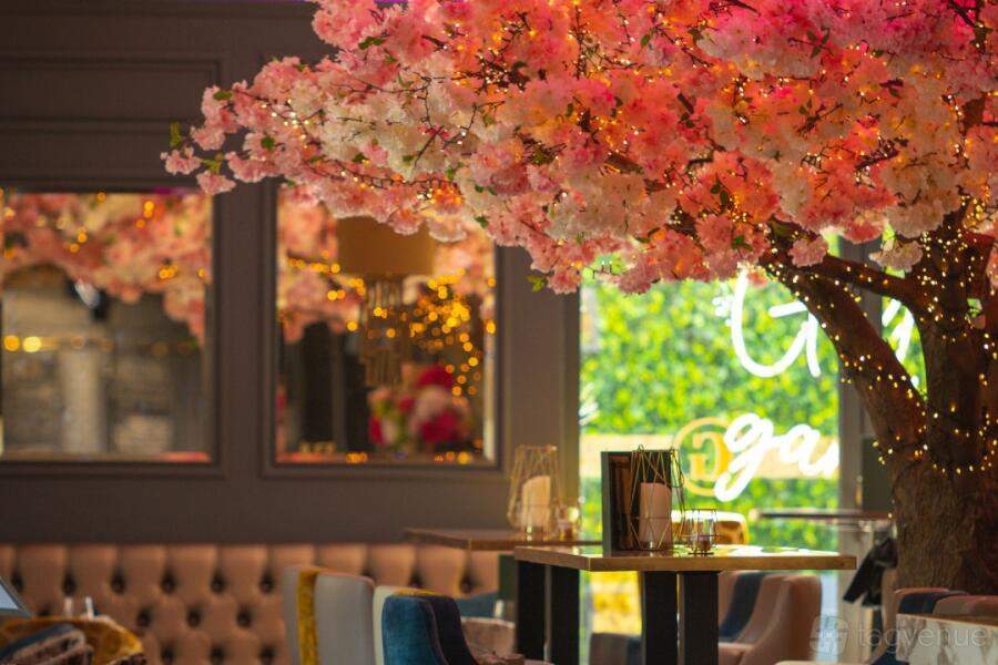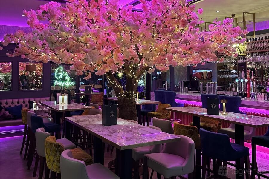 With walls fully covered in green plants, a projector, a neon sign, and pinkish lighting, it creates a stylish atmosphere - perfect for hen parties, birthday celebrations, and small functions.