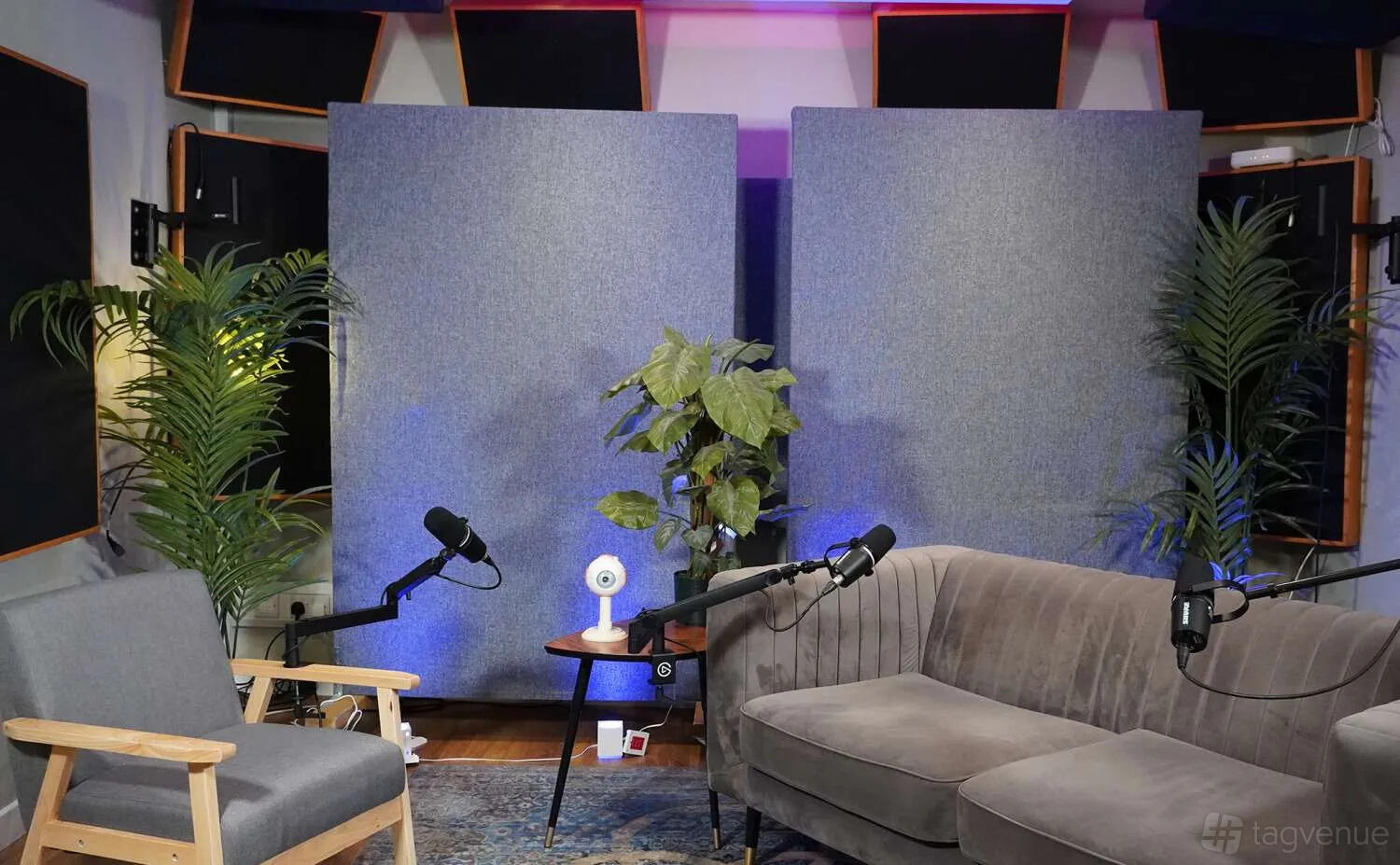 Studio 1 is a flexible space that can be configured in a number of ways, including a presenter's desk for up to 5 people, a relaxed sofa for up to 4 people and a green screen.