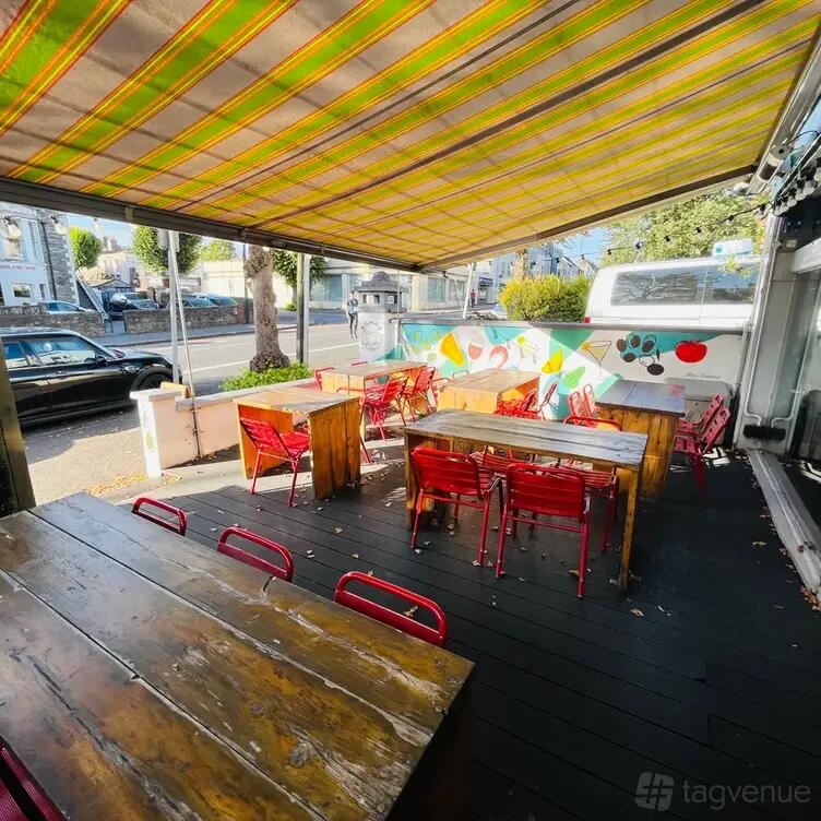 A neon "Bomba" sign on the teal wall adds a stylish touch, and the open layout makes the space feel airy and welcoming. We also have an outside decking area that is covered with a large awning with and is lit up for outside guests.