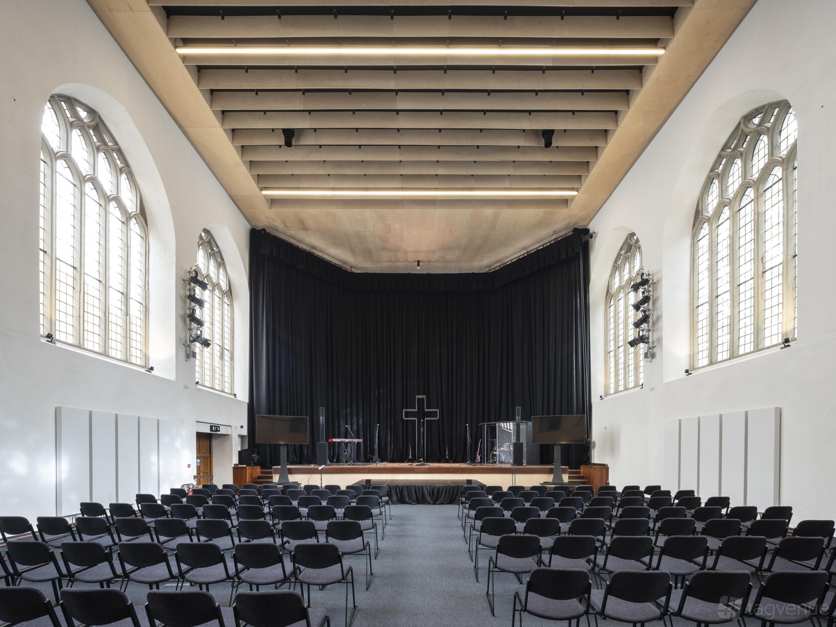 The modern church nave is a striking example of traditional architecture with contemporary design. With a seating capacity of 250 and room for 350 standing, the space can accommodate a vibrant mix of events.