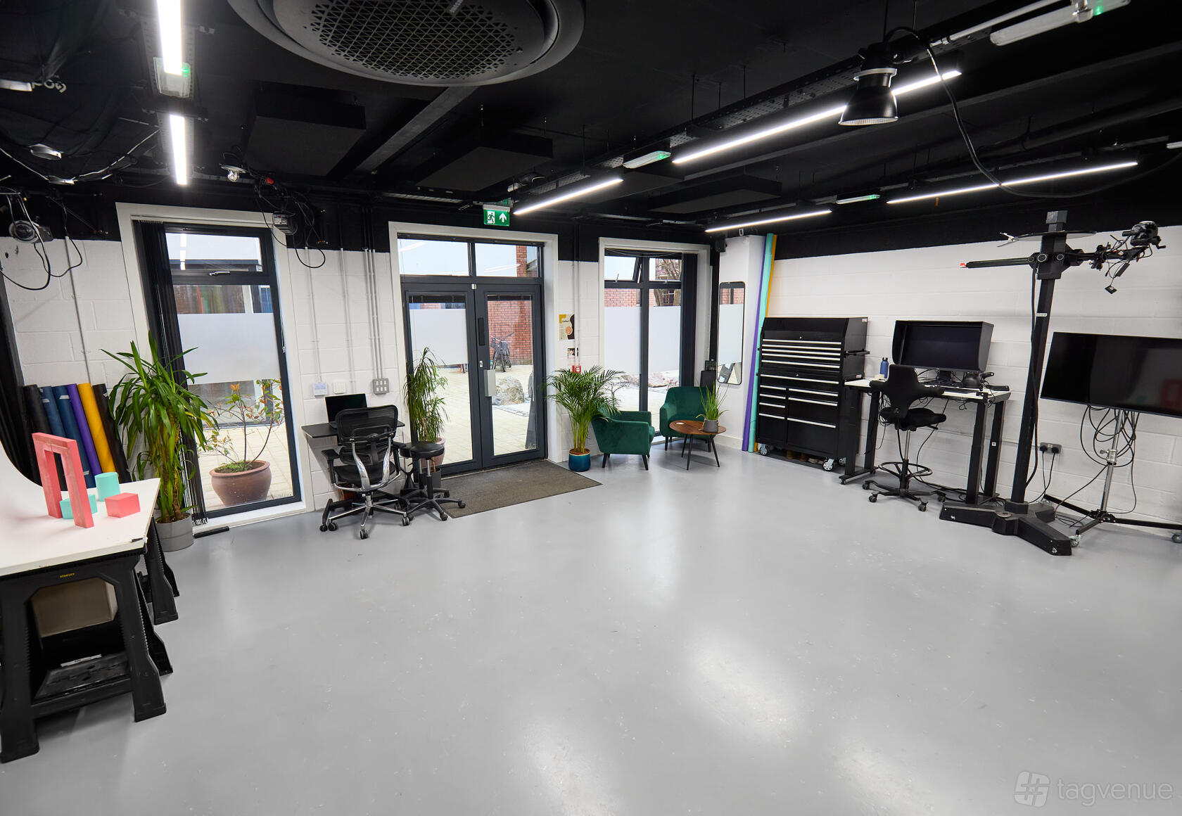 The flooring is a neutral grey and solid epoxy floor for maximum stability. Overhead lighting consists of 9x 5600K LED strips and illuminate the space very well and can be turned off in rows of three.