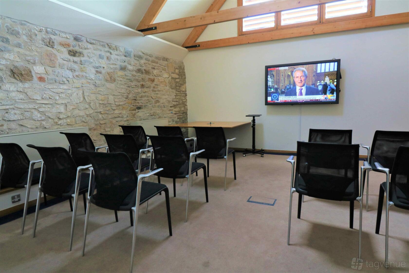 The desk has pop-up energy and AV connections for the 60 inch Panasonic wall-mounted screen and speakers. There is WiFi and Wired internet access, natural daylight through remotely operated Velux Windows (also with remote controlled blinds) and dimmable lighting. Outside the room is a breakout area with a fridge for chilled drinks.