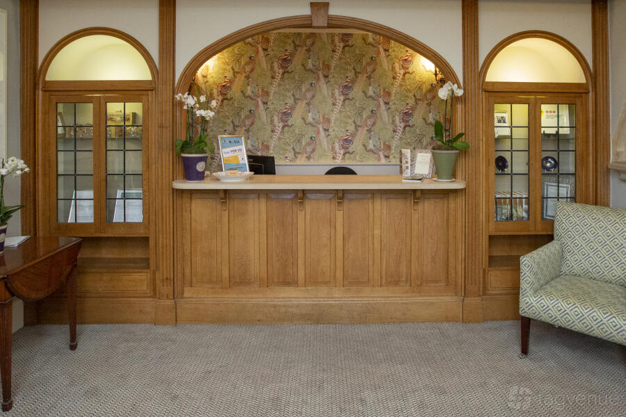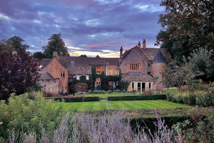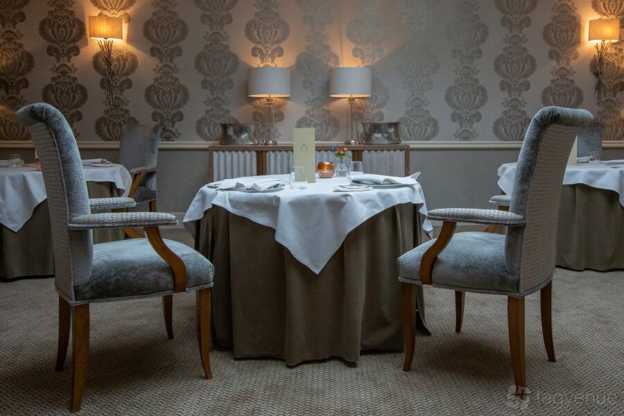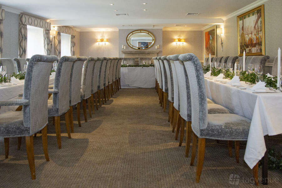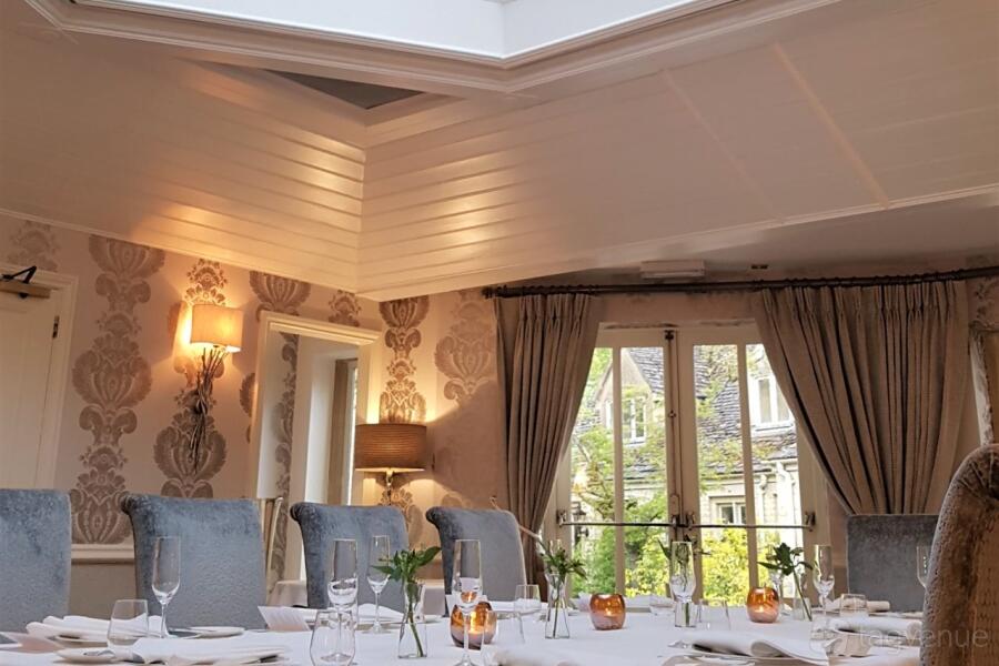 The Garden Room at Lords of the Manor is an elegant space, suitable for private meetings and events. The large windows offer views of the surrounding gardens. The room is decorated with a blend of classic and modern elements, making it a refined atmosphere.