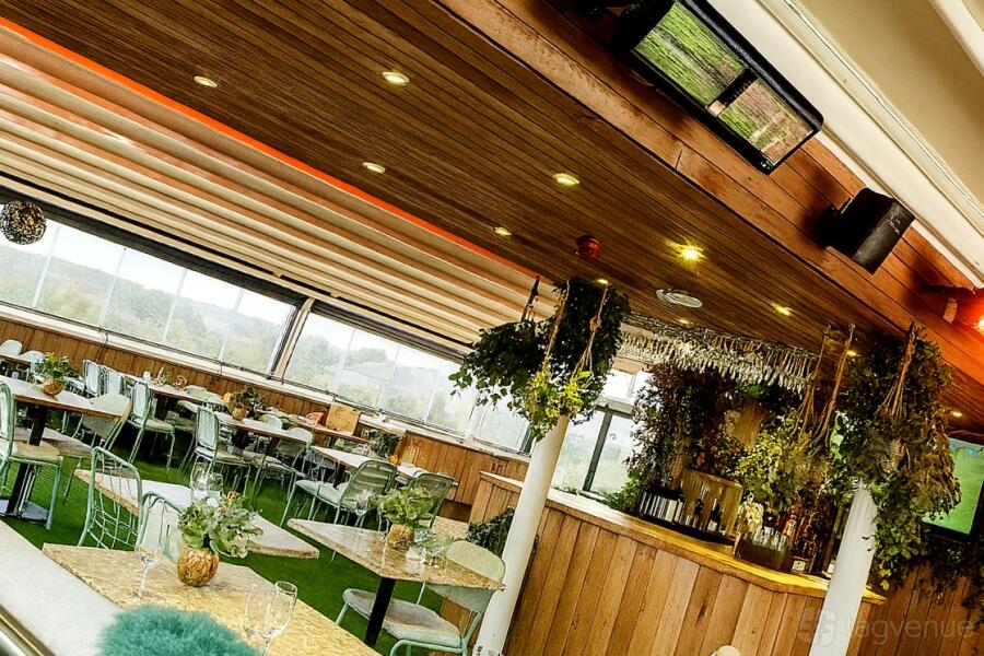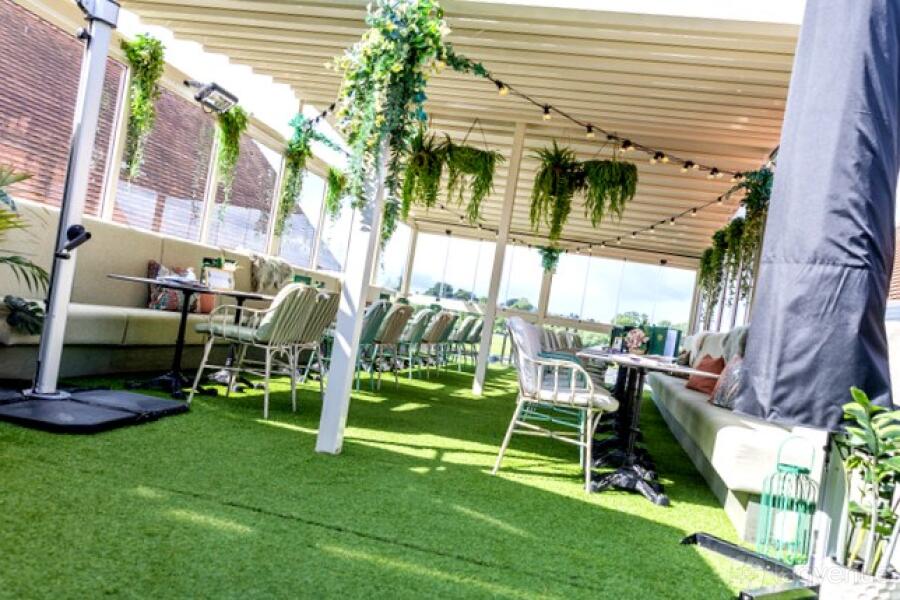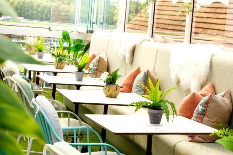 1539 at Chester Racecourse has full-length glass walls overlooking the track, an open-plan dining area, and a rooftop terrace with greenery. It’s got a clean, modern vibe with lots of natural light—works well for anything from dinners to low-key corporate events or private parties.Inside,the tables sit on a clean open floor plan, while a leafy rooftop terrace adds green vibes.