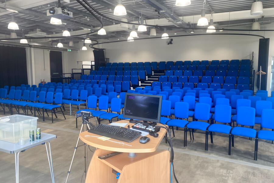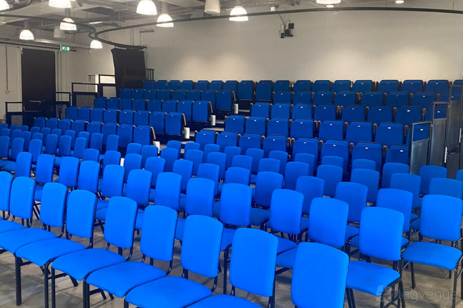 144-capacity curved 3D cinema with 9 projectors, an advanced sound system, and a comprehensive AV system. Features staggered cinema seating, ideal for film screenings, conferences, and product launches.