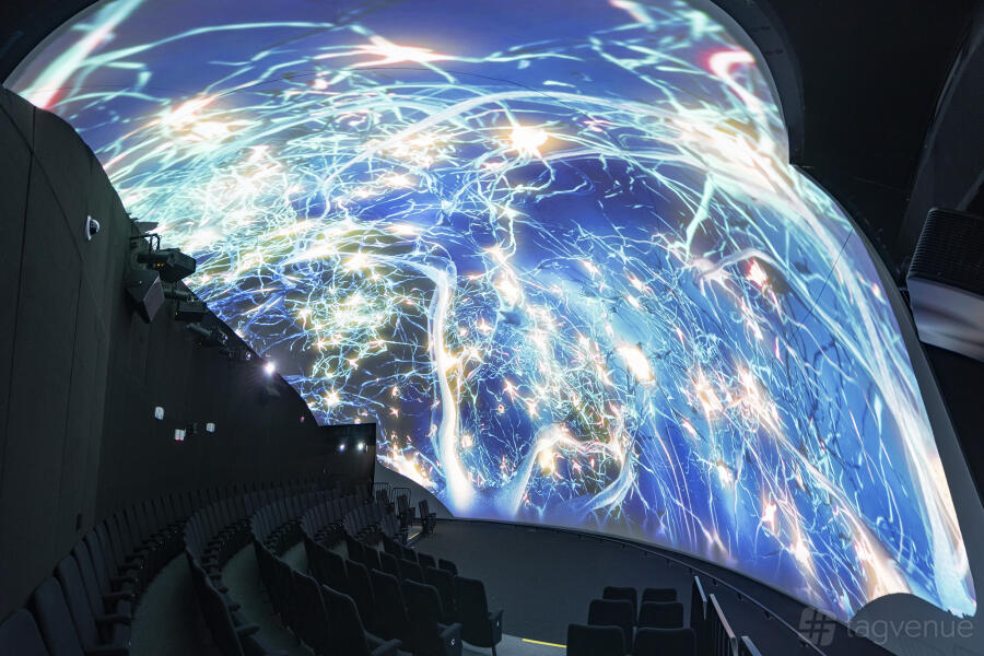 The space features an integrated AV and sound system, a large projector screen, widescreen TVs, and 360-degree cameras for both audience and presenter, enabling full hybrid functionality.