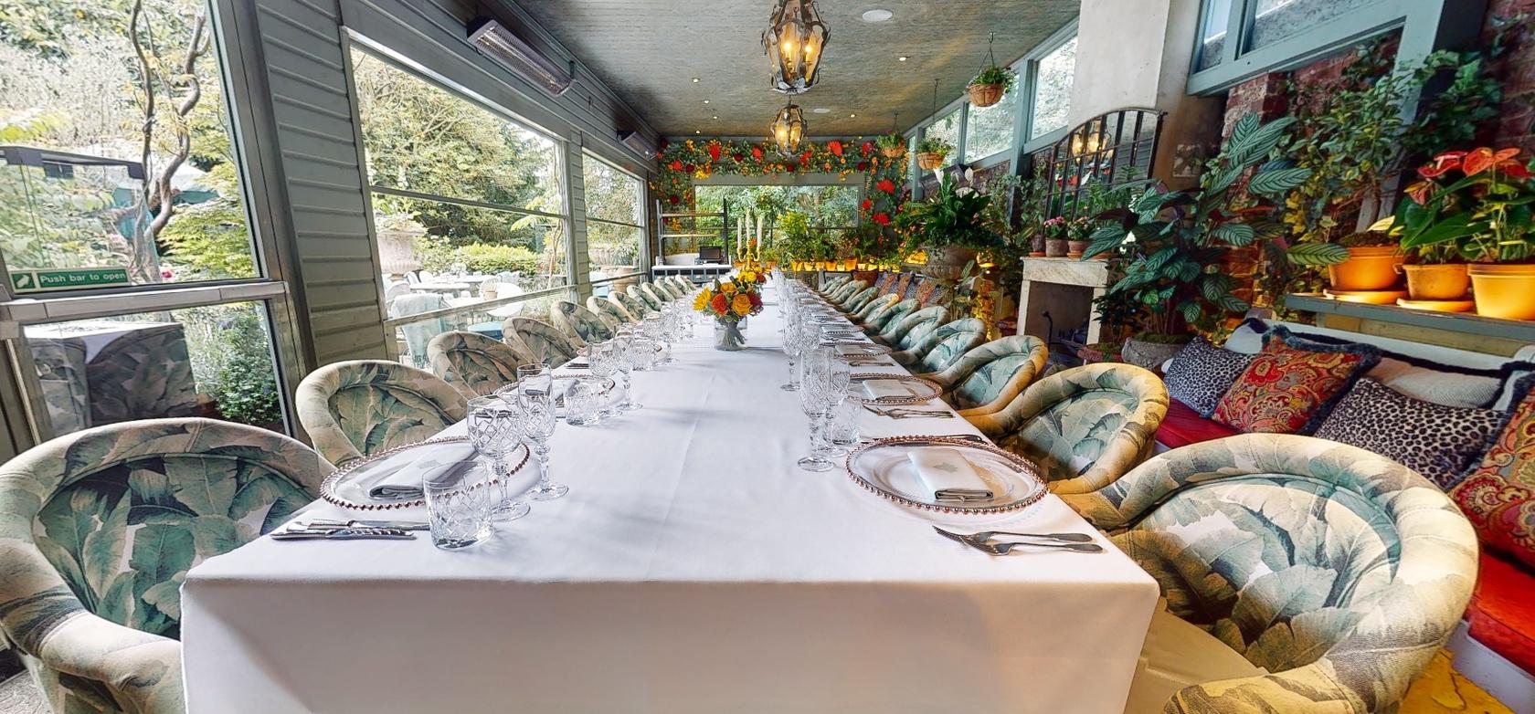 Through huge windows, you can watch our garden area while dining. The Orangery can fit different amounts of guests according to the setting you choose.