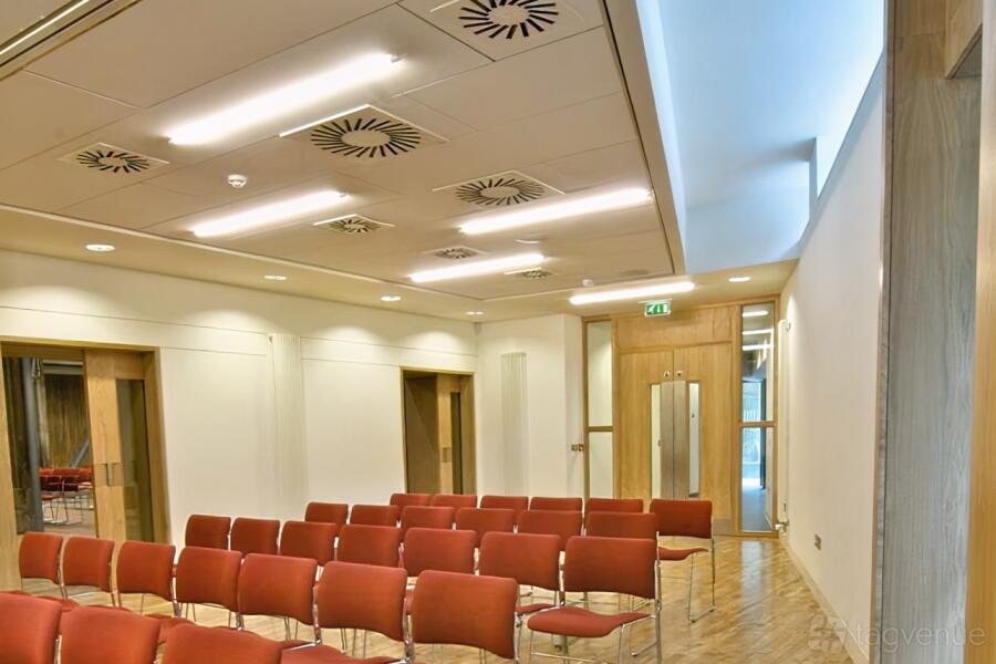 This versatile space is ideal for smaller meetings or as an excellent breakout room for larger conferences, perfect for holding seminars and workshops. The room's flexible layout can accommodate various configurations, including theatre, cabaret, or other setups, featuring a large projector screen and comfortable furnishings. With ample windows providing plenty of natural daylight, it creates a bright and inviting atmosphere.