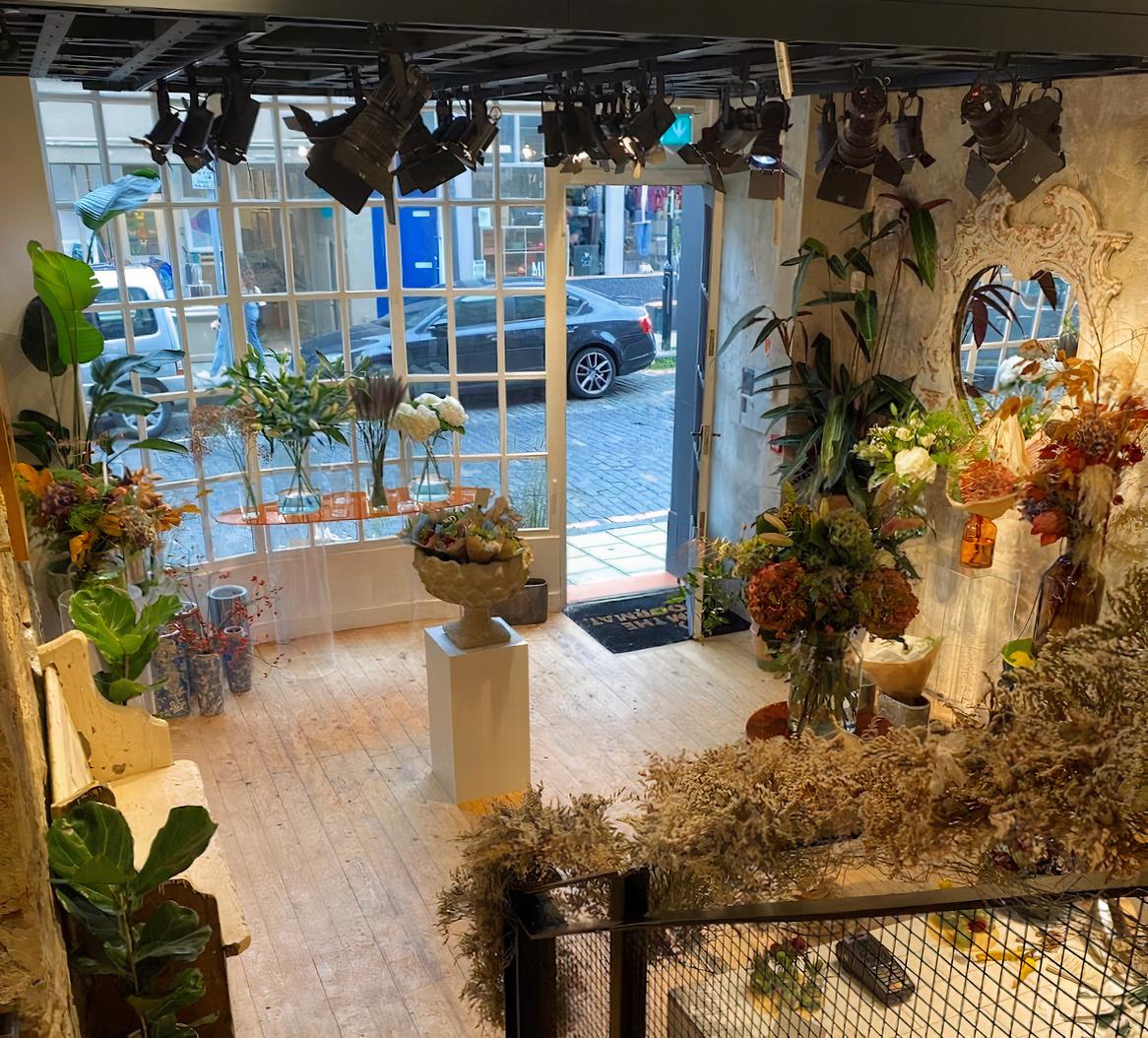A beautiful retail/gallery space that functions as a stylish florist during the daytime and a unique venue in the evening, located in the centre of Edinburgh. The space features a charming Dickensian shop front with astragal windows, a high-end modern interior finish, and a high-spec lighting system. It includes concrete wall finishes, bespoke concrete units, industrial elements, high ceilings, wooden floors, and perspex plinths adorned with our signature bouquets . The walls are adorned with artwork on loan from a specialist gallery.