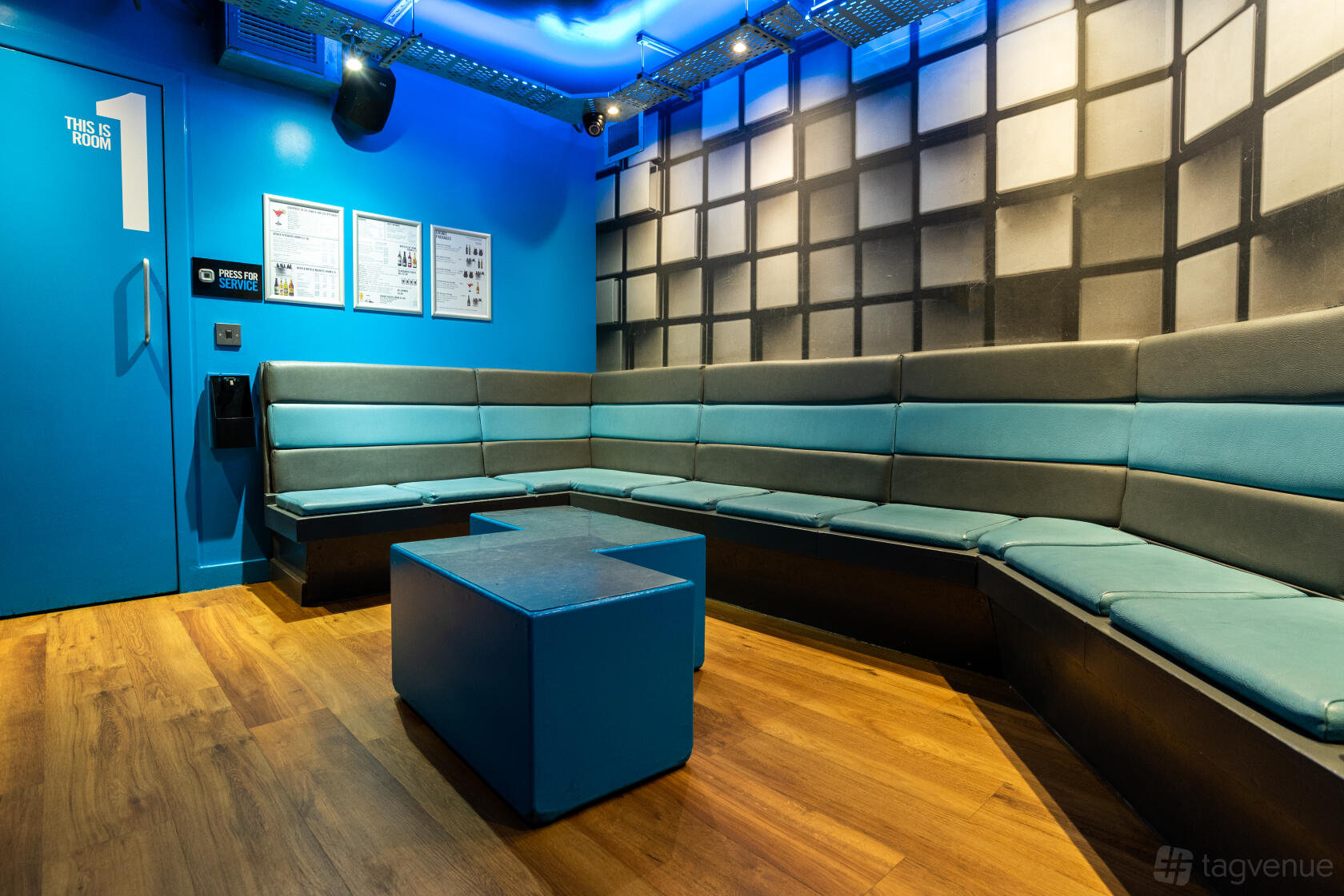 The large room is designed to fit up to 18 people on booth seating along the wall. Two mics are available for guests, along with a projector for lyrics screening and a touchscreen karaoke system.