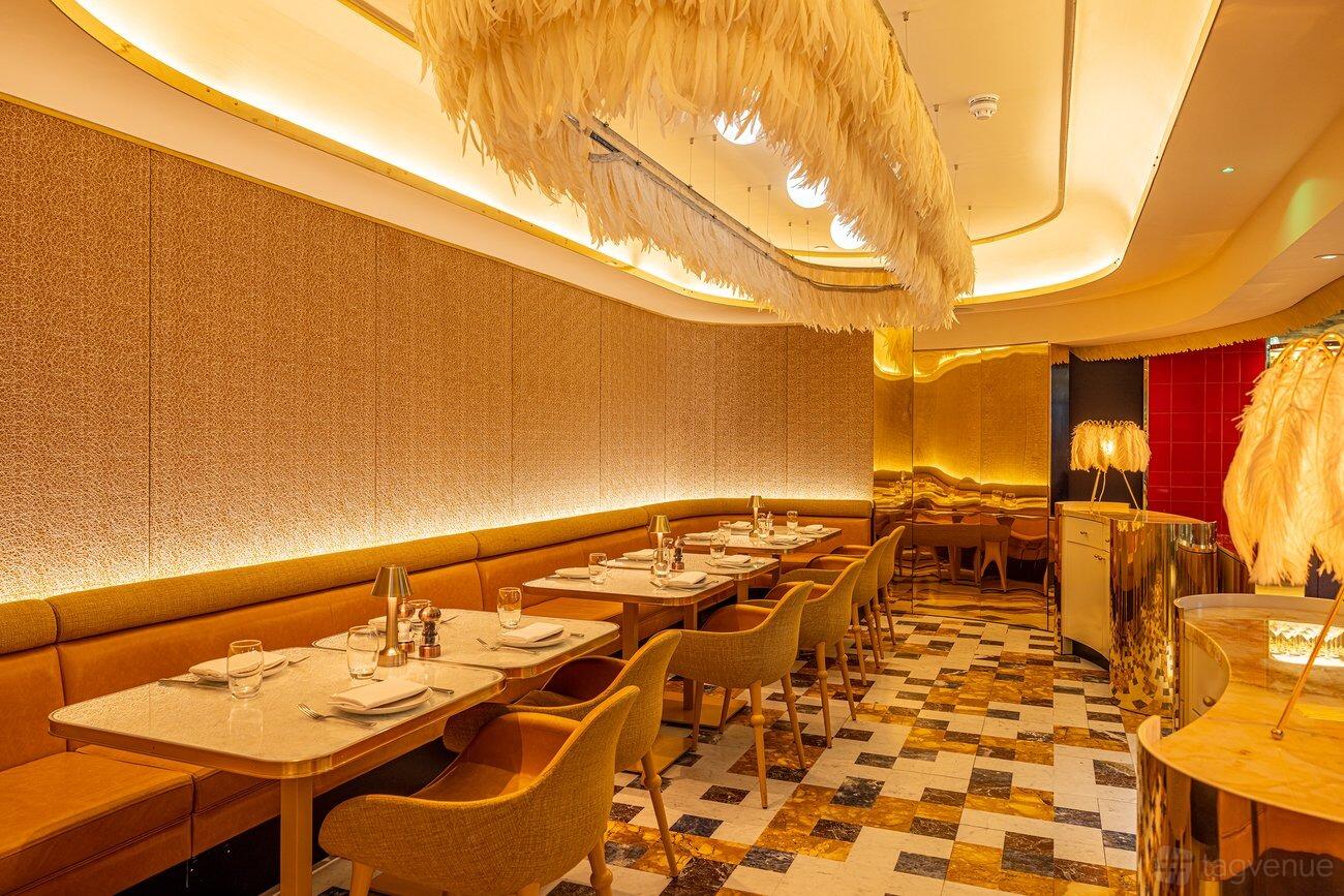 Bring your closest friends and family and settle into this gorgeously ‘feathered’ semi-private dining room offering a cosseted, epicurean experience. From its organic tangle of lace and feathered chandeliers and tabletops, to the colourful nod to the golden duck bill through the yellow upholstery and wall cladding – it’s a room designed for comfort and memory-making, accommodating 20 guests for a seated event.