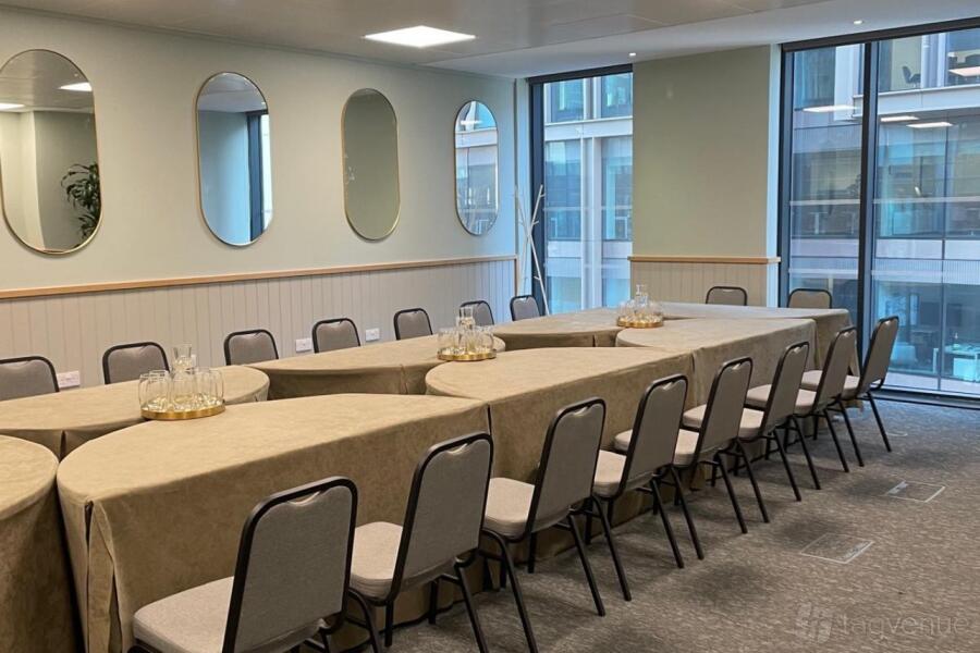 A beautiful 12 person meeting room, equipped with a large TV, a Flipchart and stationery. Complimentary tea and coffee is also provided in the room and served to your guests. This room has bespoke modern design and includes flexible furniture. The room is a perfect training room and suitable for workshops, team meetings, board meetings and more.