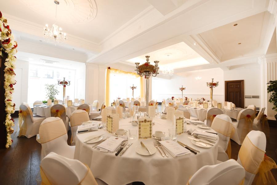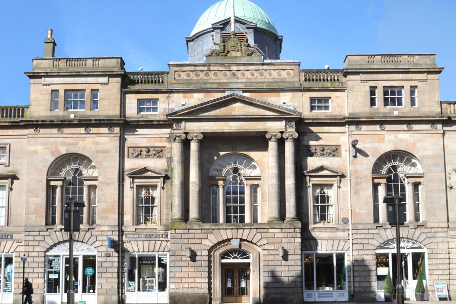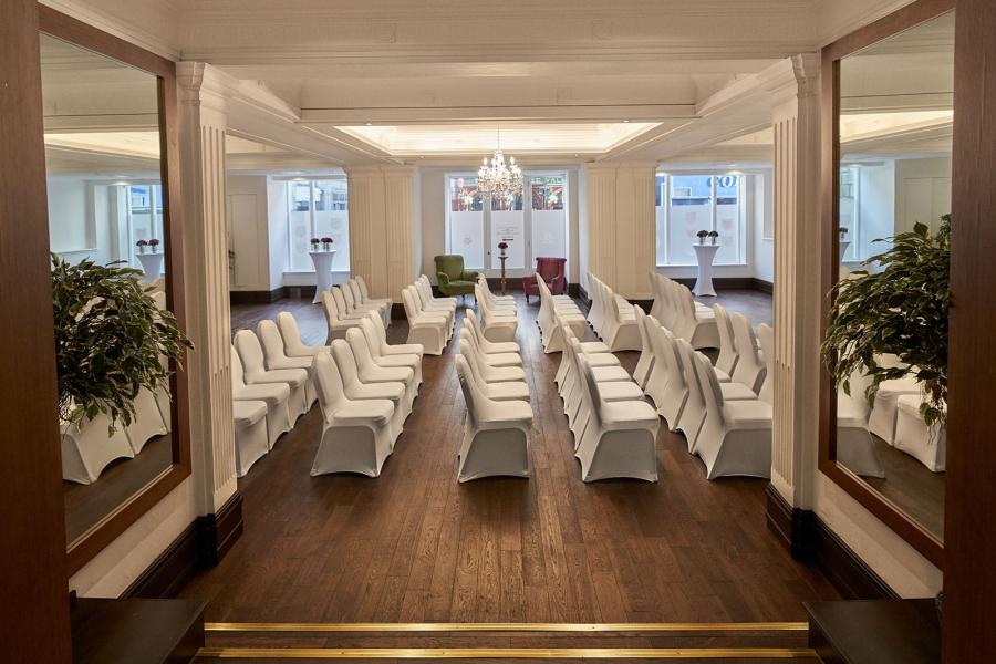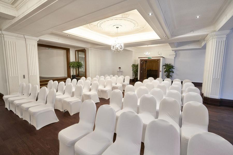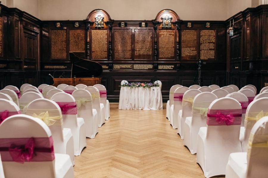 The Grand Hall is an exceptional venue with a luxurious late Victorian design, natural light from five arched windows offering views of Glassford Street, and five exquisite chandeliers.