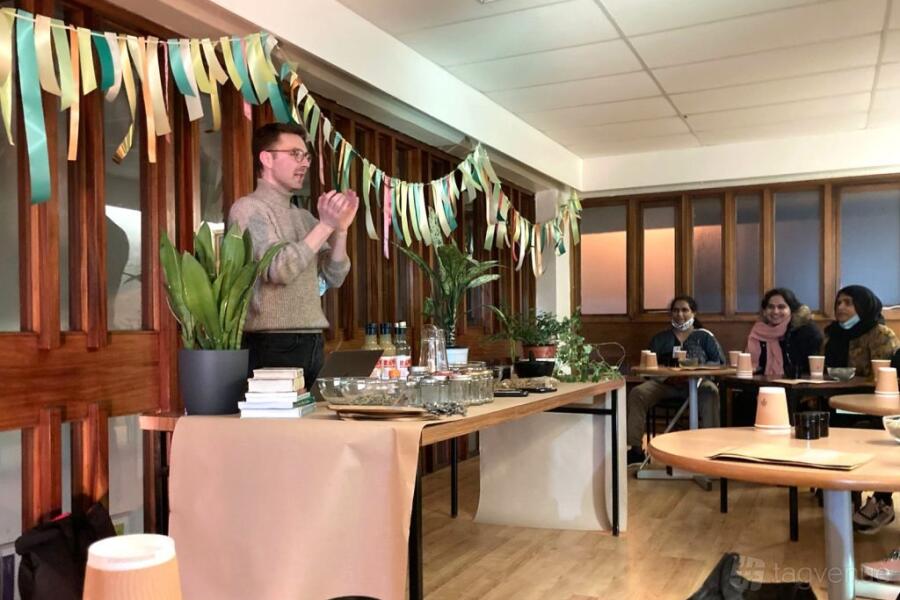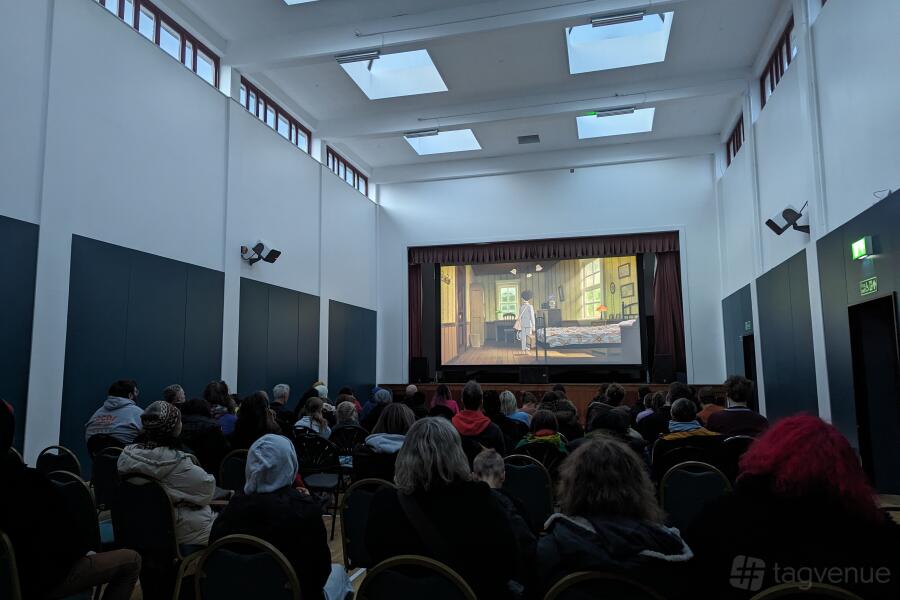 The Community Room is an internal meeting room right at the main entrance of the building, with floor-to-ceiling windows into the ground floor foyer area and sliding blackout curtains for privacy. The room is set up with equipment to facilitate hybrid online/in person meetings and events, with a ceiling-mounted projector and built-in electronically lowered screen, also ideal for presentations, small film screenings, and workshops. The room can comfortably seat 50 people, or 60 standing, making it ideal for community group meetings or gentle exercise classes.