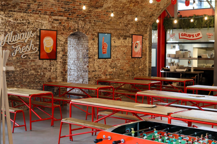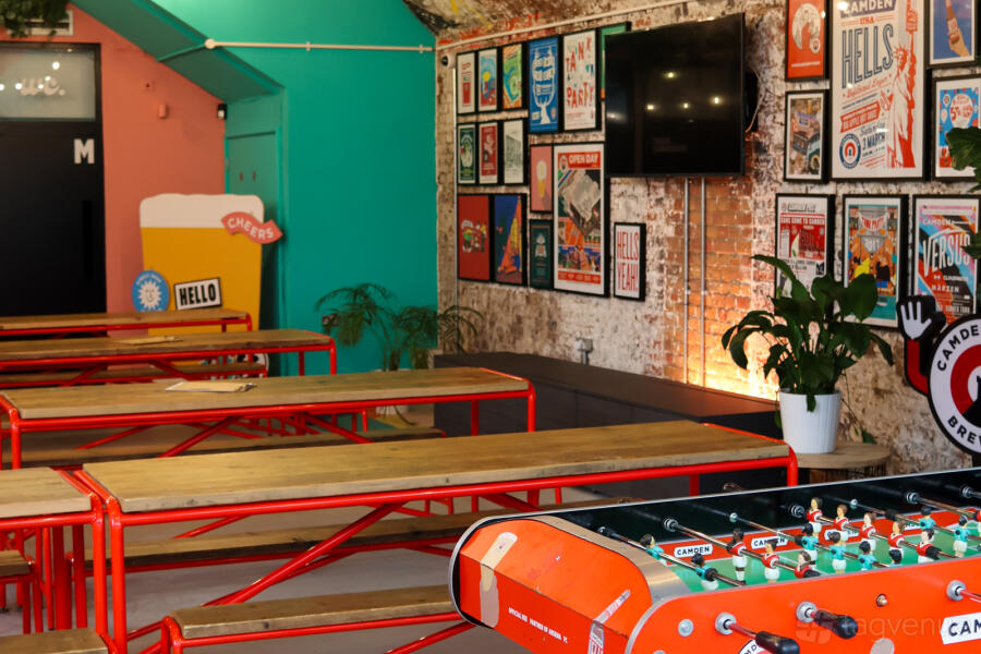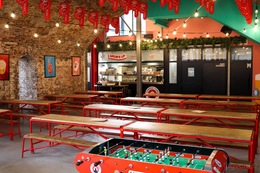 Our entire venue is available for exclusive hire, holding up to 220 guests. Our interiors include long tables, exposed bricks, and industrial elements. The space has a large hall with high ceilings, a bar area, and a foosball table.